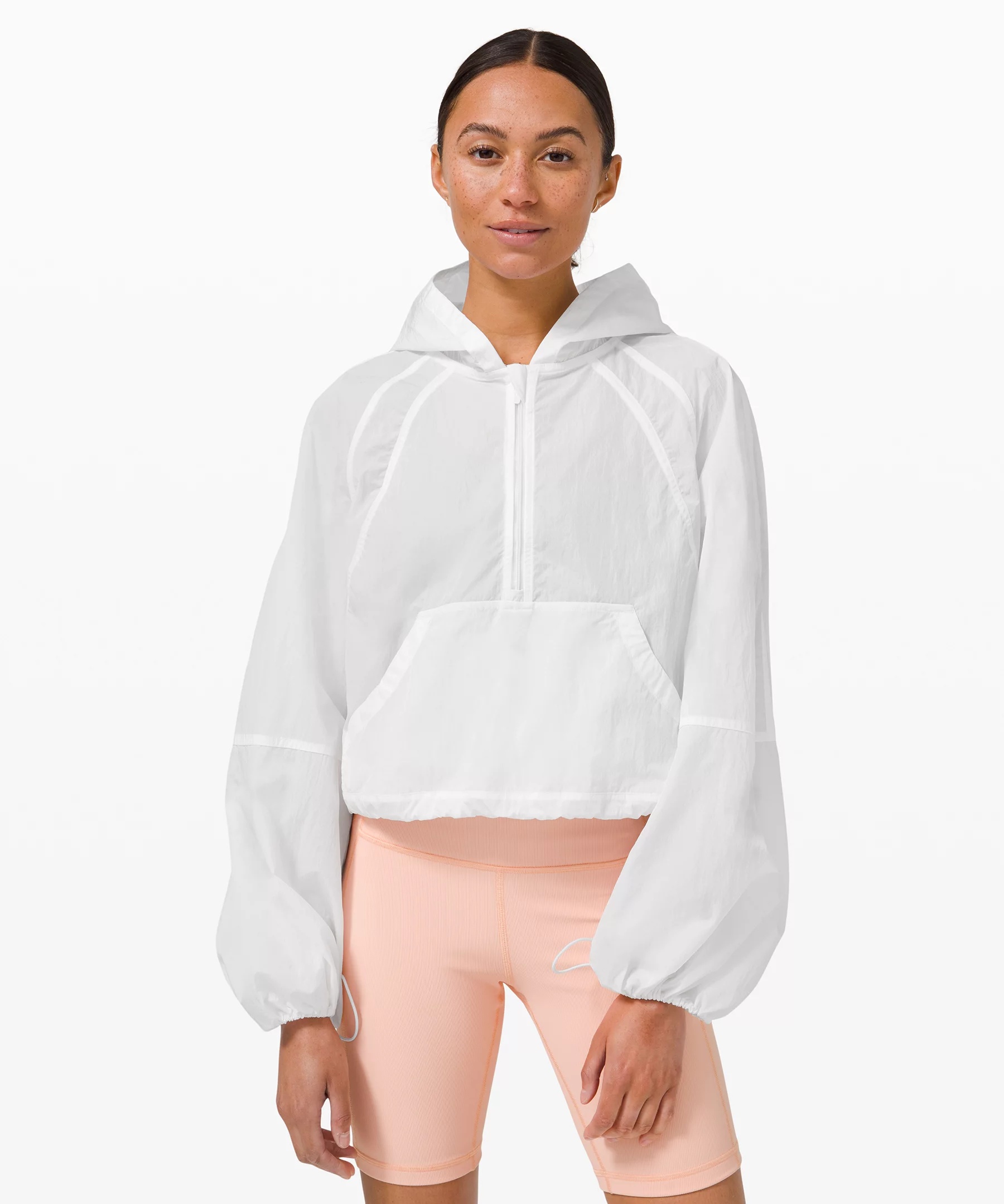 Water-Repellent Fabric Relaxed Fit Relaxed fit feels roomy and can be worn over larger layers. Size down if you prefer a slimmer fit Cropped length Product Features Cinchable sleeves and hem Zipper garage keeps chafe in check Kangaroo pocket Material and care Materials Body: 100% Nylon Care Wash with like colours Machine wash cold Do not bleach Tumble dry low Do not iron Do not dry clean Imported