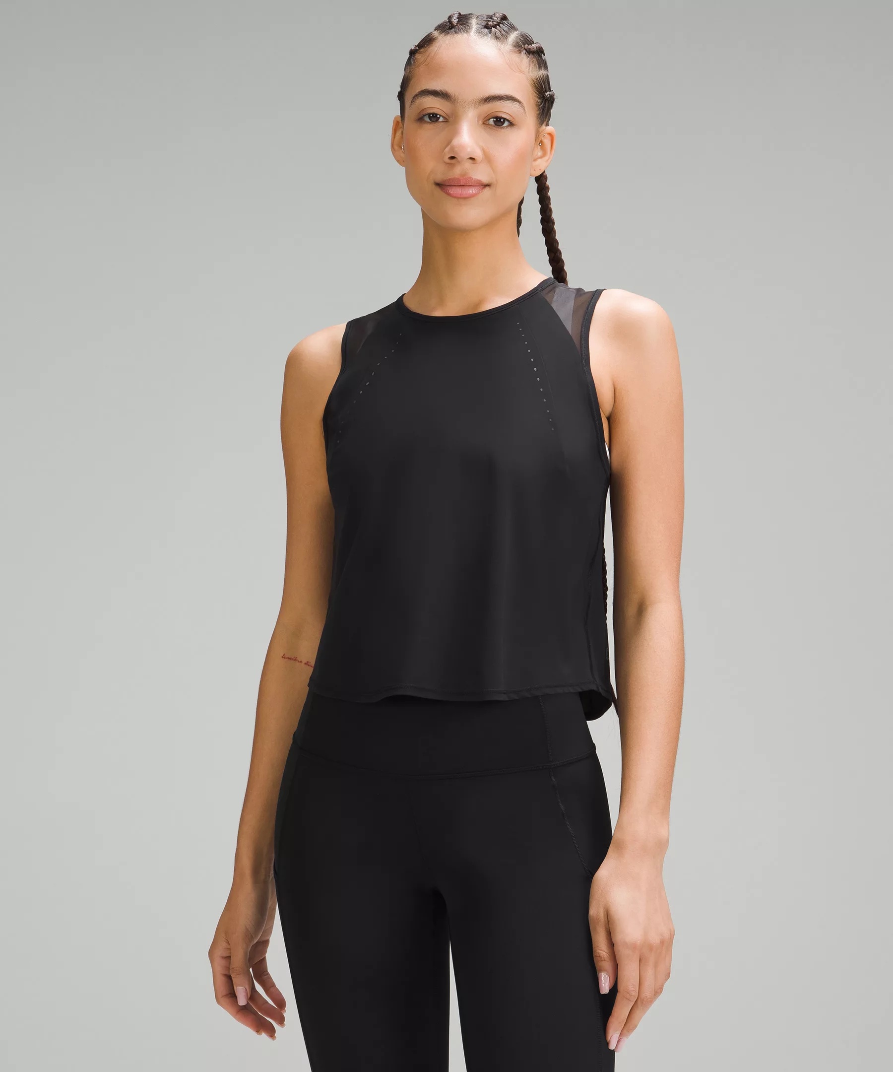 Sweat-Wicking Fabric Sweat-wicking Four-way stretch Quick-drying Mesh fabric panels for ventilation Classic Fit, Cropped Length An easy fit that floats away from your body Cut above the waist—perfect with high-rise pants Product Features Reflective details Material and care Materials Mesh: 79% Nylon21% Xtra life lycra® elastane Body: 76% Nylon24% Elastane Care Wash with like colours Machine wash cold Do not bleach Tumble dry low Do not iron Do not dry clean Imported