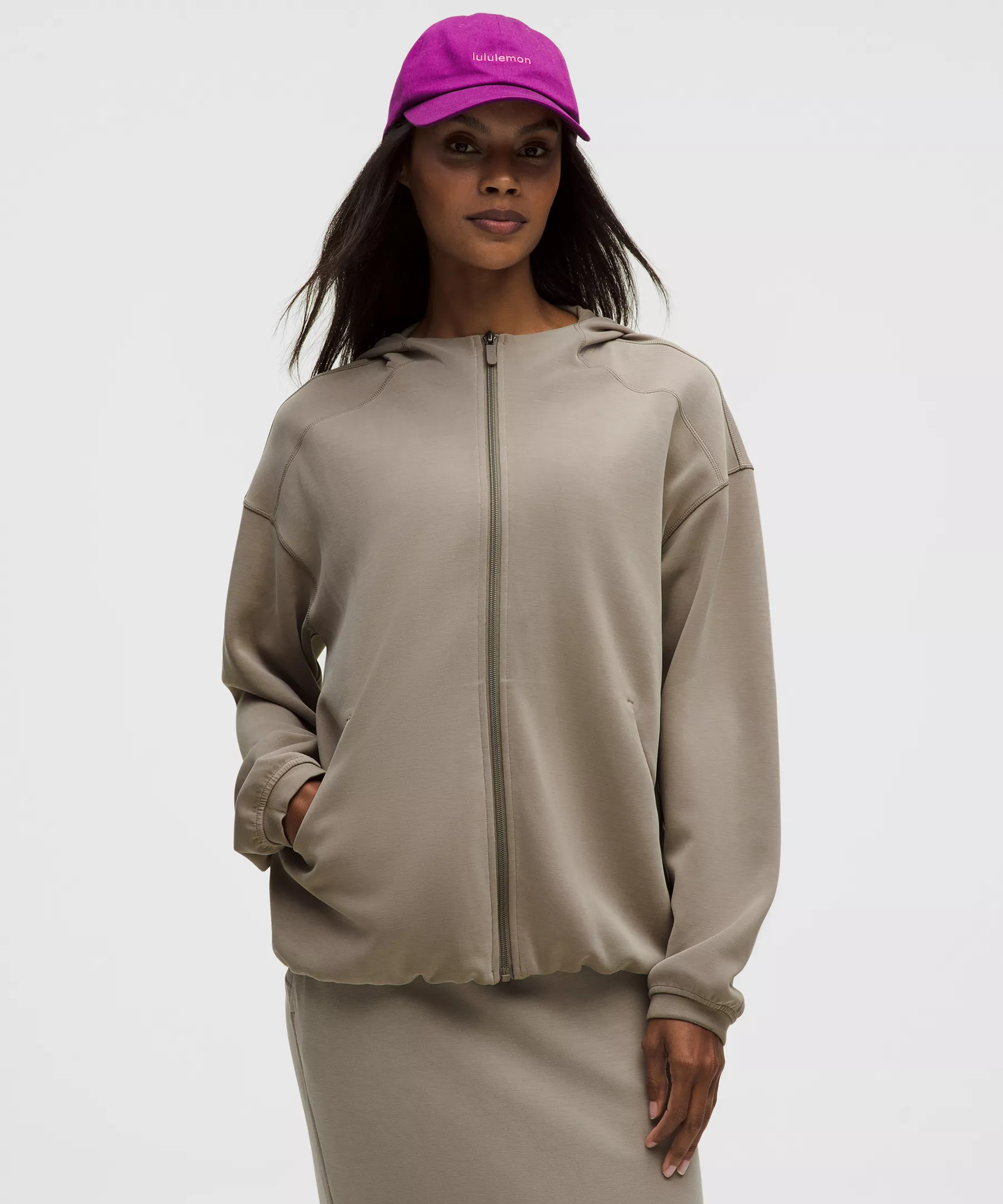 Designed for Casual Peach-Fuzz Soft, Softstreme™ Fabric - Peach-fuzz soft texture - Feels smooth next to skin - Four-way stretch - Weighty drape - Machine washable. Water drops can easily mark this fabric—a simple wash will remove them - Front lined in soft cotton jersey Oversized Fit, Hip Length - An exaggerated fit that feels extra roomy - Sits below the waistband for moderate, everyday coverage Product Features - Hand pockets, one with a hidden card sleeve Material and care Materials Cuff: 53% Recycled Polyester38% Modal9% Elastane - Hood Lining: 52% Modal38% Recycled Polyester10% Elastane - Body: 53% Recycled Polyester38% Modal9% Elastane - Front Lining: 100% Cotton Care Machine Wash Cold - Do Not Bleach - Tumble Dry Low - Do Not Iron - Do Not Dry Clean - Wash Inside Out With Zipper Fully Closed - Wash Separately
