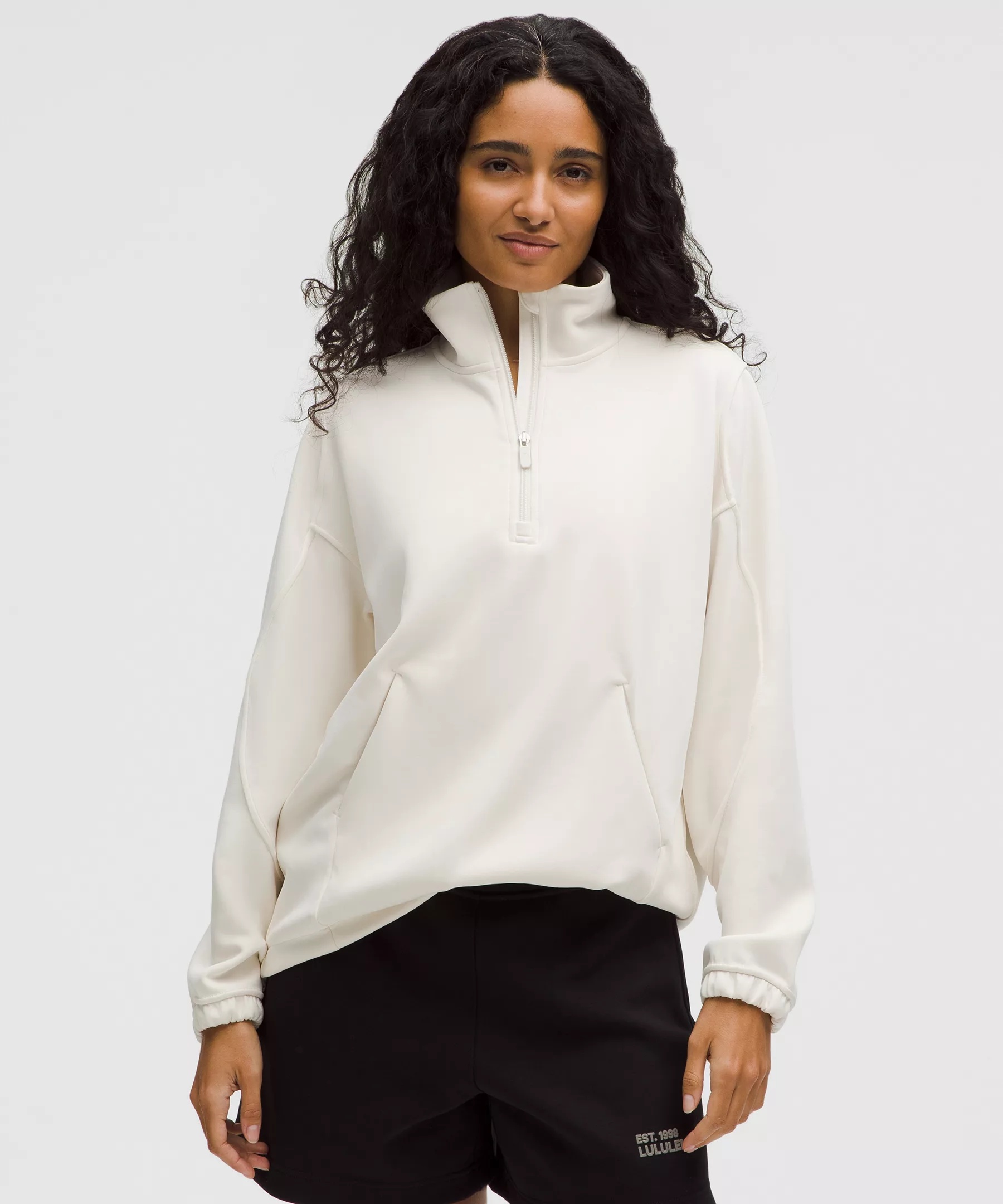 Peach-Fuzz Soft, Softstreme™ Fabric Peach-fuzz soft texture Feels smooth next to skin Weighty drape Machine washable. Water drops can easily mark this fabric—a simple wash will remove them Oversized Fit, Hip Length An exaggerated fit that feels extra roomy Sits below the waistband for moderate, everyday coverage Product Features Kangaroo pocket with a hidden card sleeve Zipper garage keeps chafe in check Cinchable hem Material and care Materials Cuff: 53% Recycled Polyester38% Modal9% Elastane Body: 53% Recycled Polyester38% Modal9% Elastane Front Lining: 100% Cotton Care Wash separately Machine wash cold gentle Do not bleach Lay flat to dry Do not iron Do not dry clean Imported