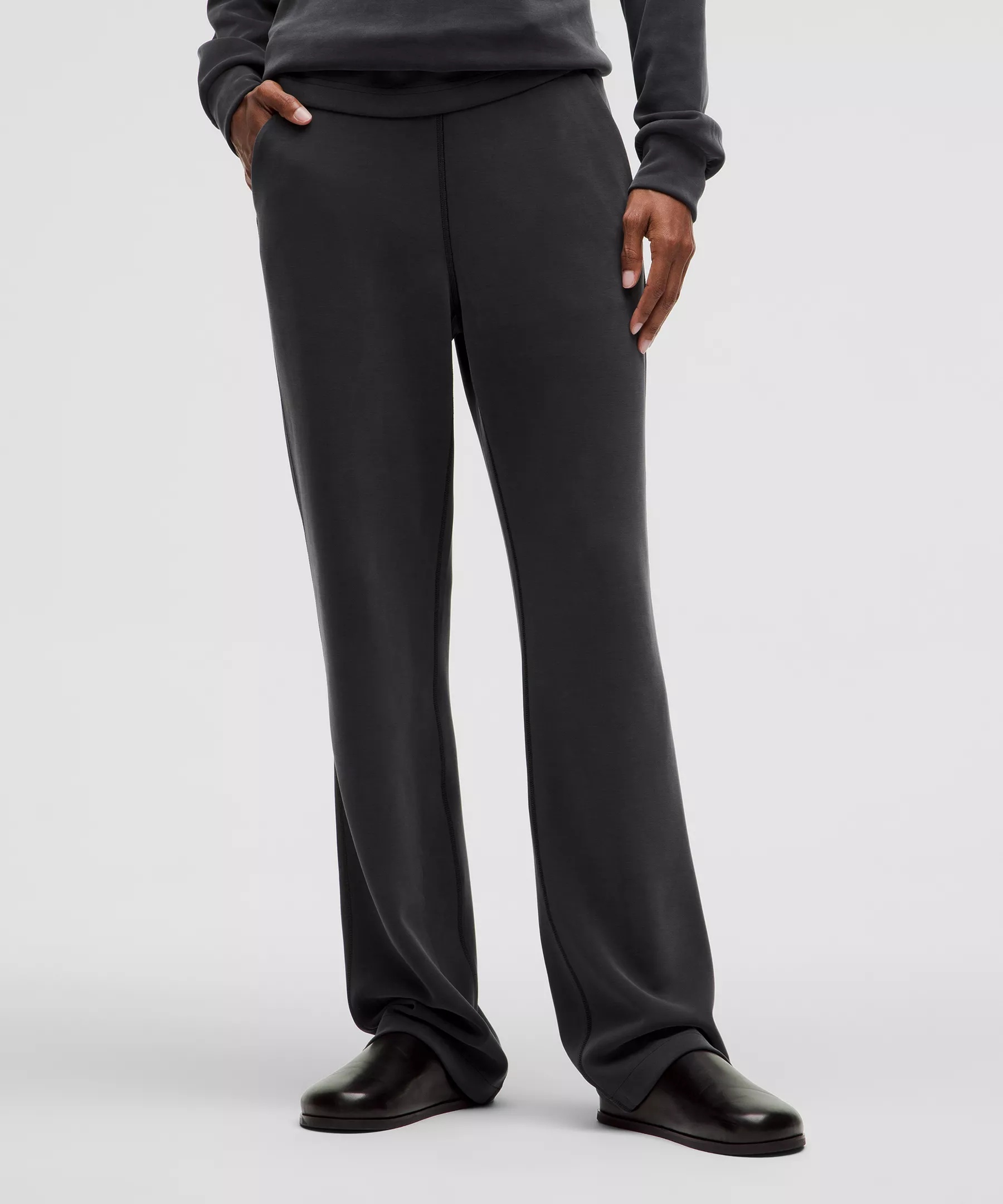 Peach-Fuzz Soft, Softstreme™ Fabric Peach-fuzz soft texture Feels smooth next to skin Four-way stretch Quick-drying Weighty drape Machine washable. Water drops can easily mark this fabric—a simple wash will remove them 100% of the polyester in this product is recycled (excluding trims) Fabric is derived from wood-based materials from well-managed forests High Rise, Full Length Slim fit skims your body Falls straight down from hip to hem 31" inseam, intended to skim the floor for heights of 5'5"–5'8" Product Features Hand pockets with hidden card sleeve Elastic waistband with a hidden drawcord Material and care Materials Pocket Lining: 86% Recycled Polyester14% Elastane Waistband: 53% Recycled Polyester38% Modal9% Elastane Body: 53% Recycled Polyester38% Modal9% Elastane Care Wash separately Machine wash cold gentle Do not bleach Lay flat to dry Do not iron Do not dry clean Imported