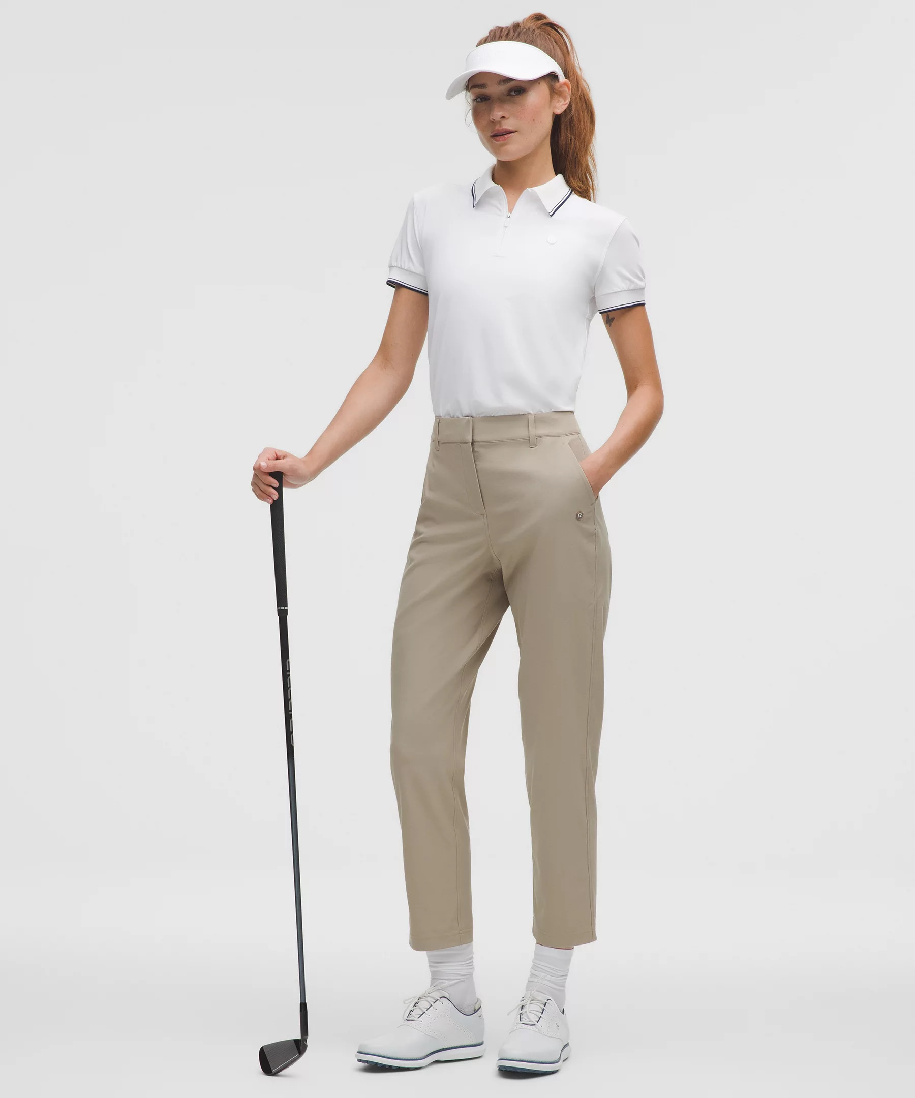 Designed for Golf Water-Repellent, Twill Fabric - Water-repellent - Four-way stretch High Rise, Full Length - Slim fit skims your body - Full length intended to sit at ankle Product Features - Hand pockets - Small drop-in pocket on the right-hand side for golf tees - Back welt pockets are stitched closed—snip the stitches to make the pockets functional - Fly front Material and care Materials Body: 90% Nylon10% Elastane - Pocket Lining: 100% Recycled Polyester Care Machine Wash Cold - Do Not Bleach - Tumble Dry Low - Do Not Iron - Do Not Dry Clean - Wash With Like Colors