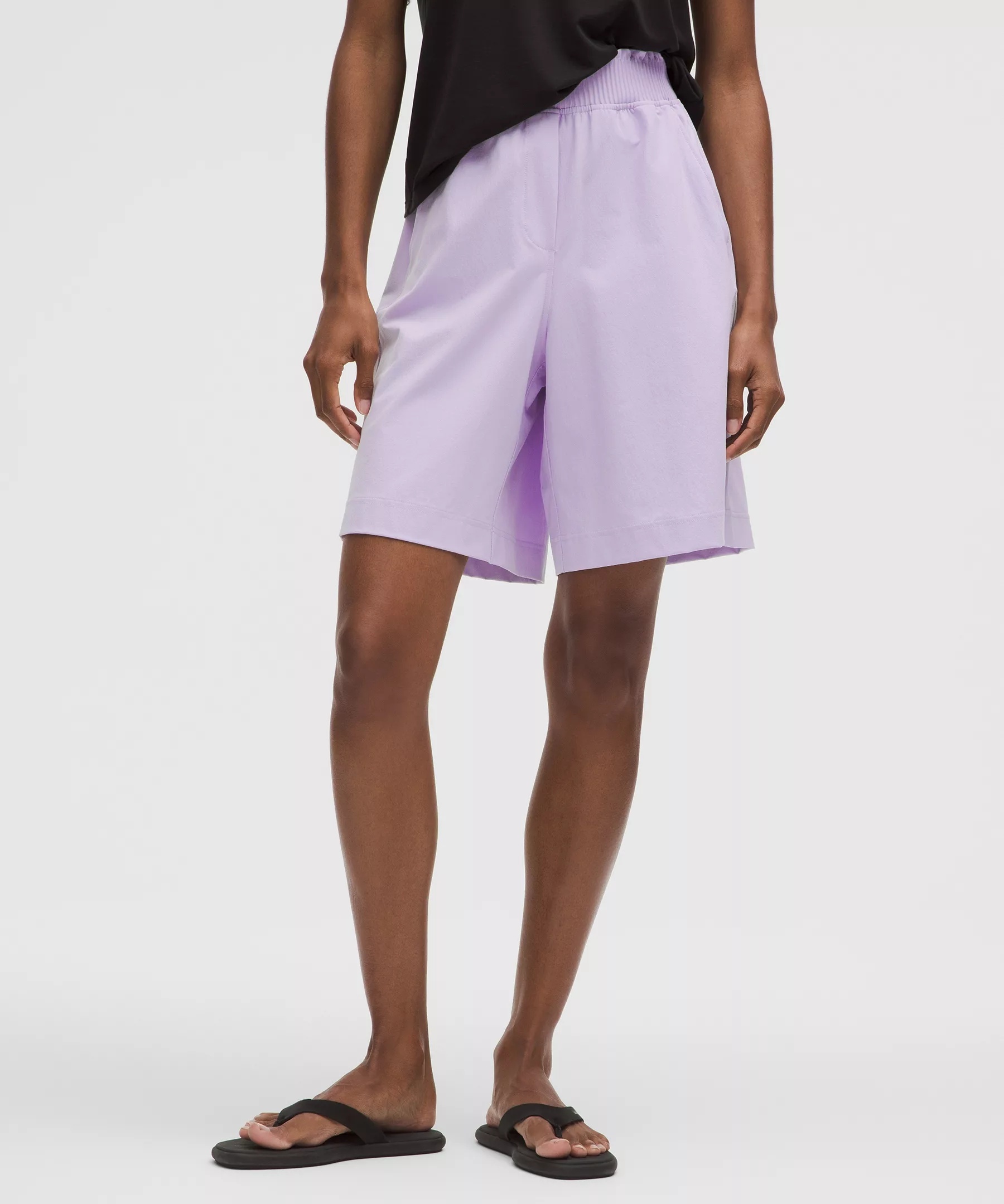 Designed for Casual Lightweight, Stretch Woven Fabric - Lightweight - Water-repellent - Fabric has a soft, crinkle texture High Rise, 9" Length - Relaxed fit is roomy through glutes and thighs Product Features - Hand pockets with hidden card sleeve - Faux fly Material and care Materials Body: 89% Nylon11% Elastane - Pockets: 86% Recycled Polyester14% Elastane Care Machine Wash Cold - Do Not Bleach - Tumble Dry Low - Do Not Iron - Do Not Dry Clean - Wash With Like Colors