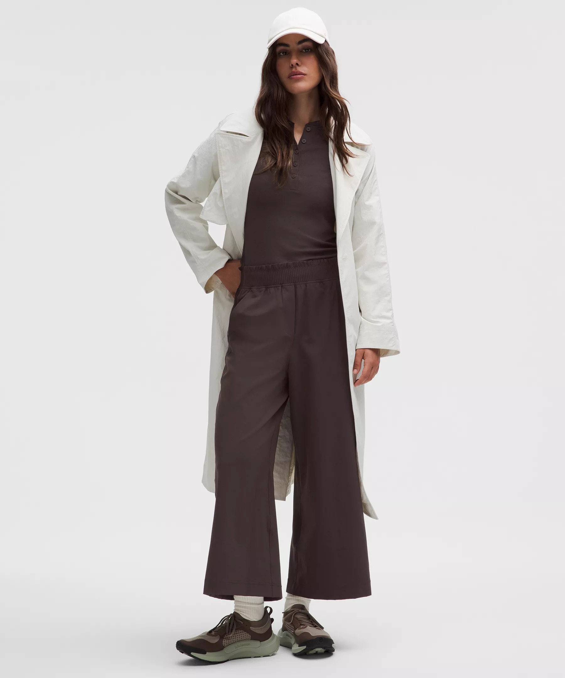 Designed for Casual Lightweight, Stretch Woven Fabric - Lightweight - Water-repellent - Fabric has a soft, crinkle texture High Rise, 25" Length - Relaxed fit is roomy through glutes and thighs - Intended to sit above ankle Product Features - Hand pockets, one with a hidden card sleeve Material and care Materials Body: 89% Nylon11% Elastane - Pocket Lining: 86% Recycled Polyester14% Elastane Care Machine Wash Cold - Do Not Bleach - Tumble Dry Low - Do Not Iron - Do Not Dry Clean - Wash With Like Colors