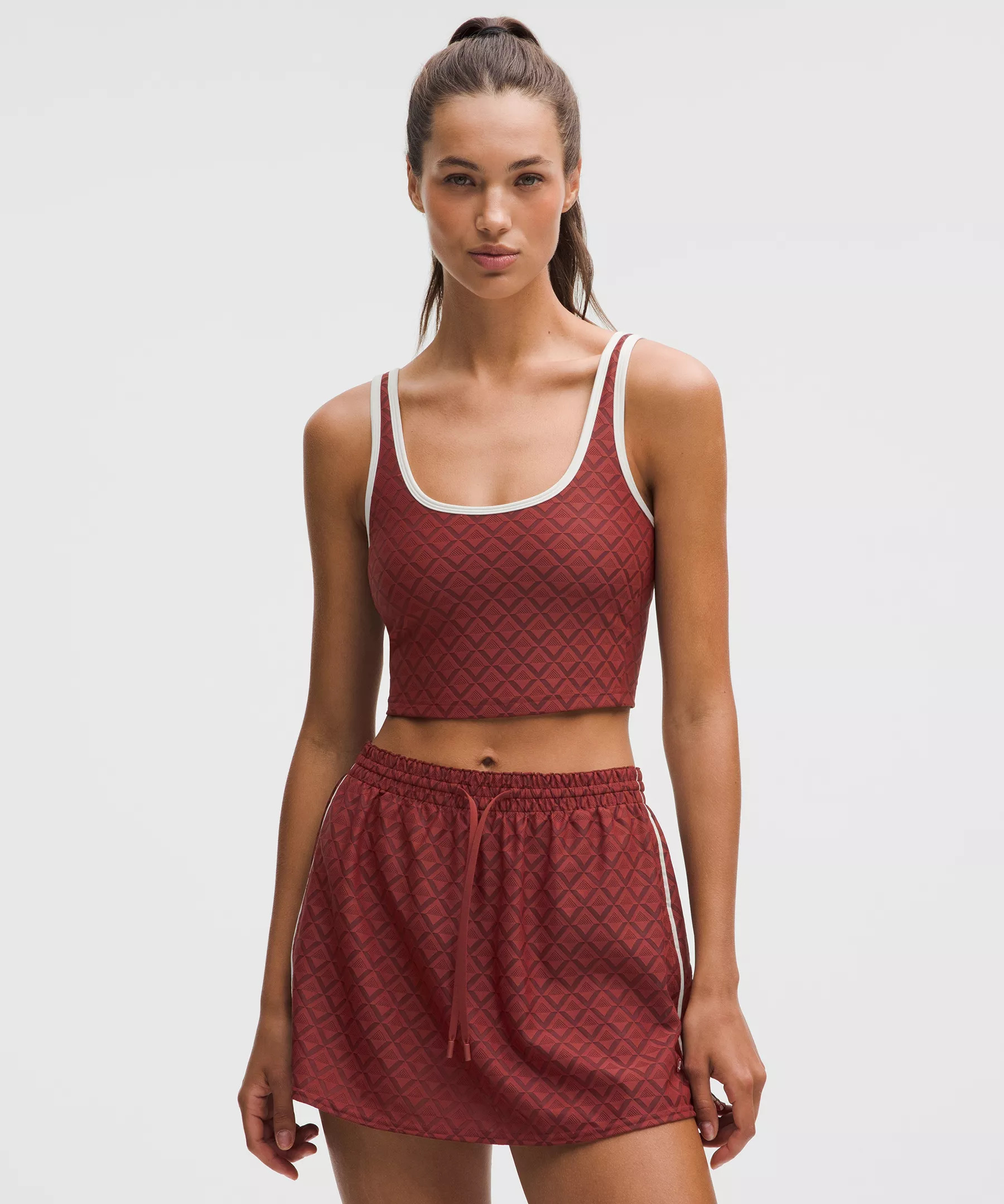 Designed for Tennis Textured Mesh Fabric - Diamond-patterned mesh - Four-way stretch - Sweat-wicking - Quick-drying Medium Support, B/C Cups - Intended to provide support for B/C cups - Tight fit contours your body - Cropped length is cut above the waist—perfect with high-rise pants - Intended for medium-impact activities Product Features - Built-in shelf bra for added support and coverage - Pockets for optional, removable cups - Lined through body for added coverage Material and care Materials Bra Lining: 90% Recycled Polyester10% Lycra Elastane - Lining: 83% Recycled Polyester17% Elastane - Middle Layer: 89% Recycled Nylon11% Elastane - Body: 79% Nylon21% Lycra Elastane Care Machine Wash Cold - Do Not Bleach - Tumble Dry Low - Do Not Iron - Do Not Dry Clean - Wash With Like Colors