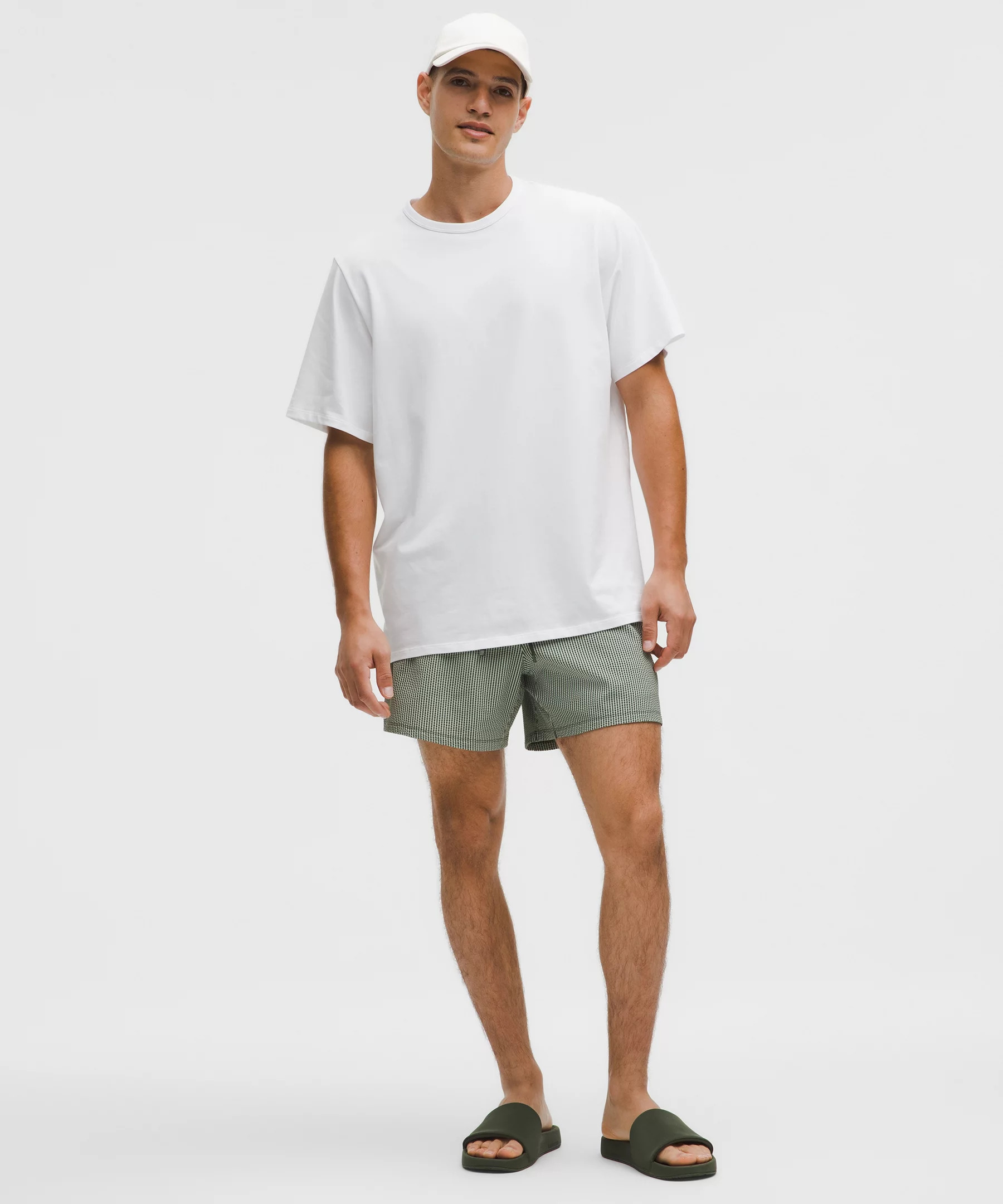 Designed for Swim Chlorine-Resistant, Textured Fabric - Chlorine-resistant - Four-way stretch - Water-repellent - Crinkled texture - This product contains recycled nylon made from repurposed plastic waste Classic Fit, 5" Length - Streamlined fit that gives glutes and thighs breathing room Product Features - Hand pockets with hidden phone sleeve - Back zippered pocket with drainage hole and key loop - Silicone artwork on drawcord provides extra grip in the water - Waistband drawcord helps you customize the fit Material and care Materials Body: 48% Recycled Nylon43% Nylon9% Elastane - Pockets: 80% Recycled Nylon20% Elastane Care Machine Wash Cold - Do Not Bleach - Tumble Dry Low - Do Not Iron - Do Not Dry Clean - Wash With Like Colors