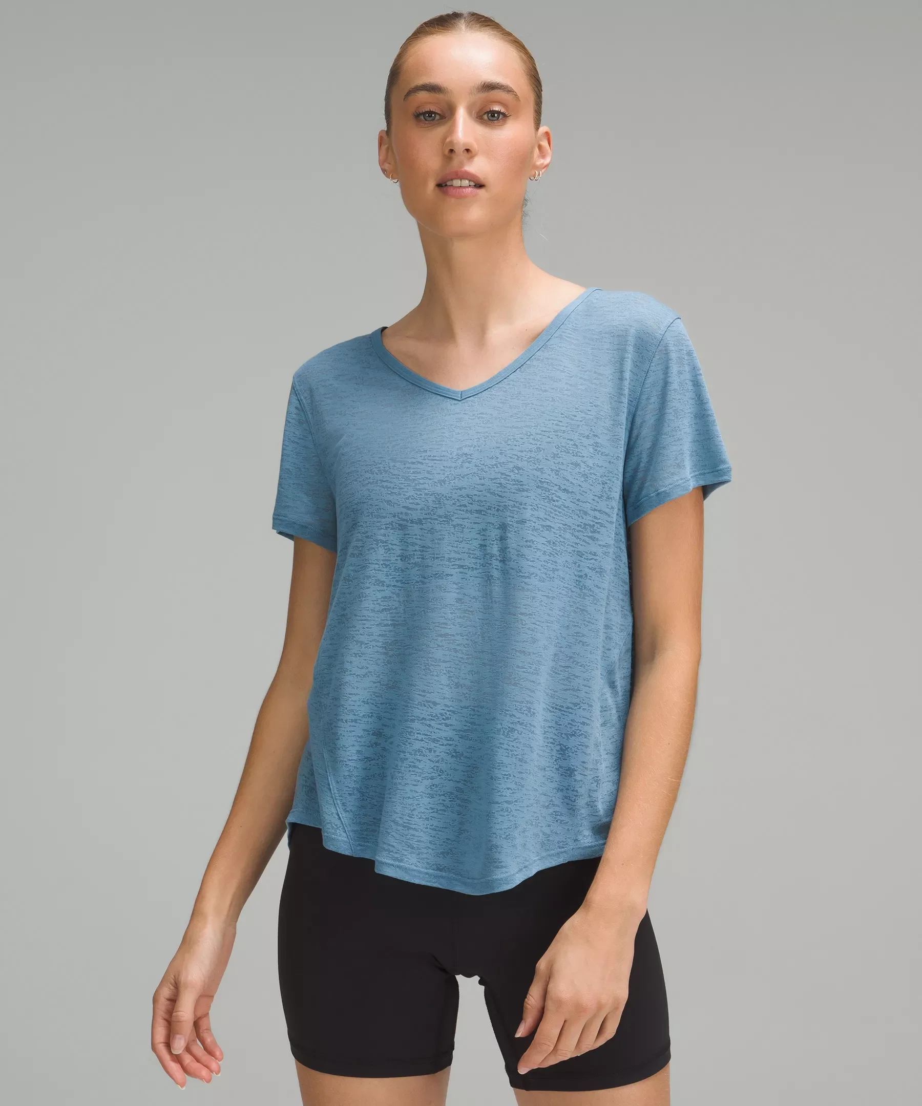 Designed for Yoga Lightweight, Slightly Sheer Fabric - Lightweight - Slightly sheer look - Naturally breathable - Four-way stretch Classic Fit, Hip Length - An easy fit that floats away from your body - Sits below the waistband for moderate, everyday coverage - Tie it up for a snug fit at the hip Material and care Materials Body: 53% Viscose47% Polyester Care Machine Wash Cold Gentle - Do Not Bleach - Lay Flat To Dry - Do Not Iron - Do Not Dry Clean - Wash Separately