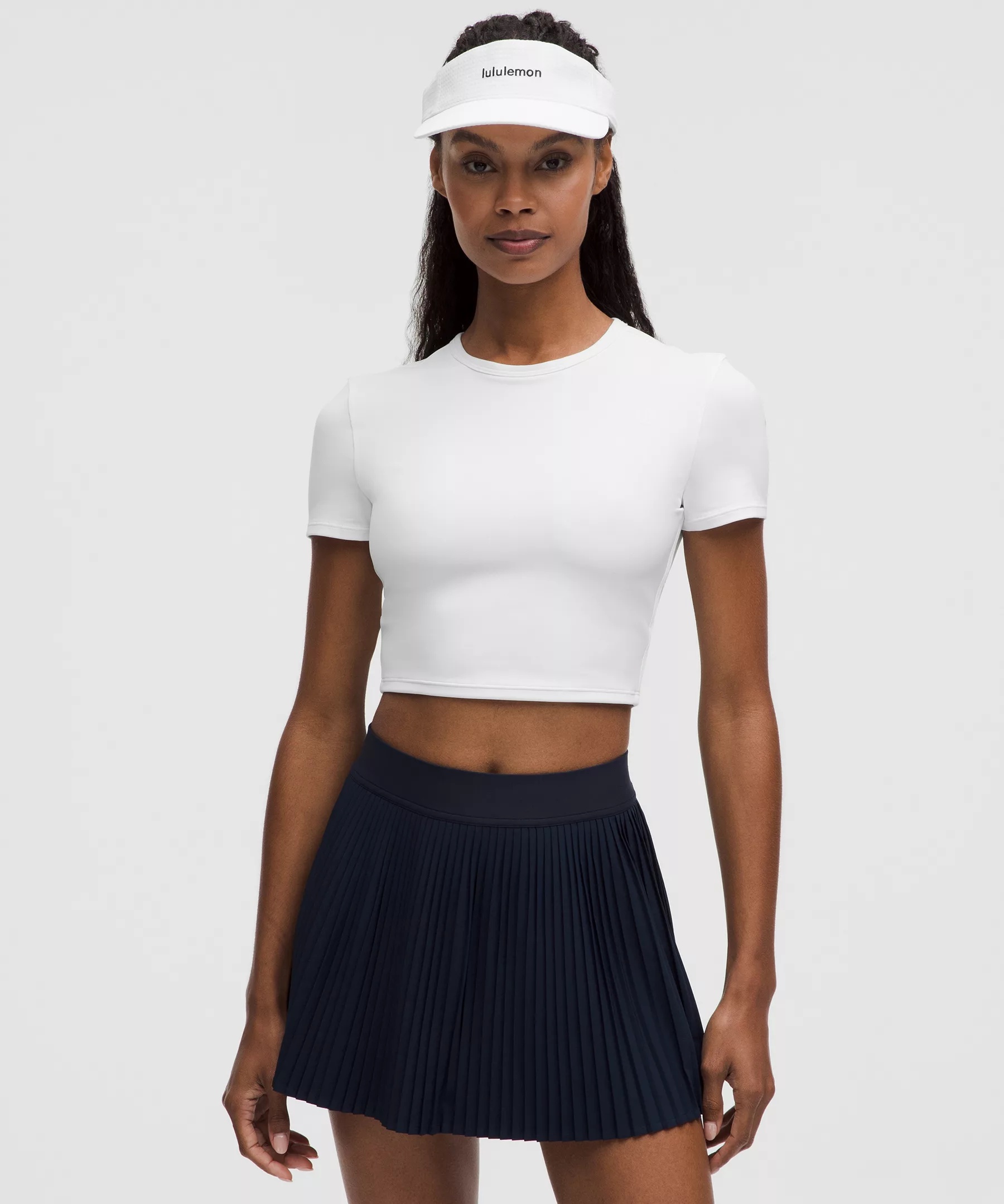 Designed for Tennis Soft, Sleek Fabric - Soft, sleek, and supportive - Sweat-wicking - Quick-drying - Has a smooth, lightweight feel with a matte finish Light Support, B/C Cups - Intended to provide light support for B/C cups - Tight fit contours your body - Cropped length is cut above the waist—perfect with high-rise pants - Intended for low-impact activities Product Features - Built-in shelf bra for added support and coverage - Pockets for optional, removable cups Material and care Materials Sleeves: 82% Nylon18% Elastane - Body: 68% Nylon32% Elastane - Bra Lining: 90% Recycled Polyester10% Lycra Elastane - Mesh: 90% Recycled Polyester10% Lycra Elastane Care Machine Wash Cold - Do Not Bleach - Tumble Dry Low - Do Not Iron - Do Not Dry Clean - Wash With Like Colors