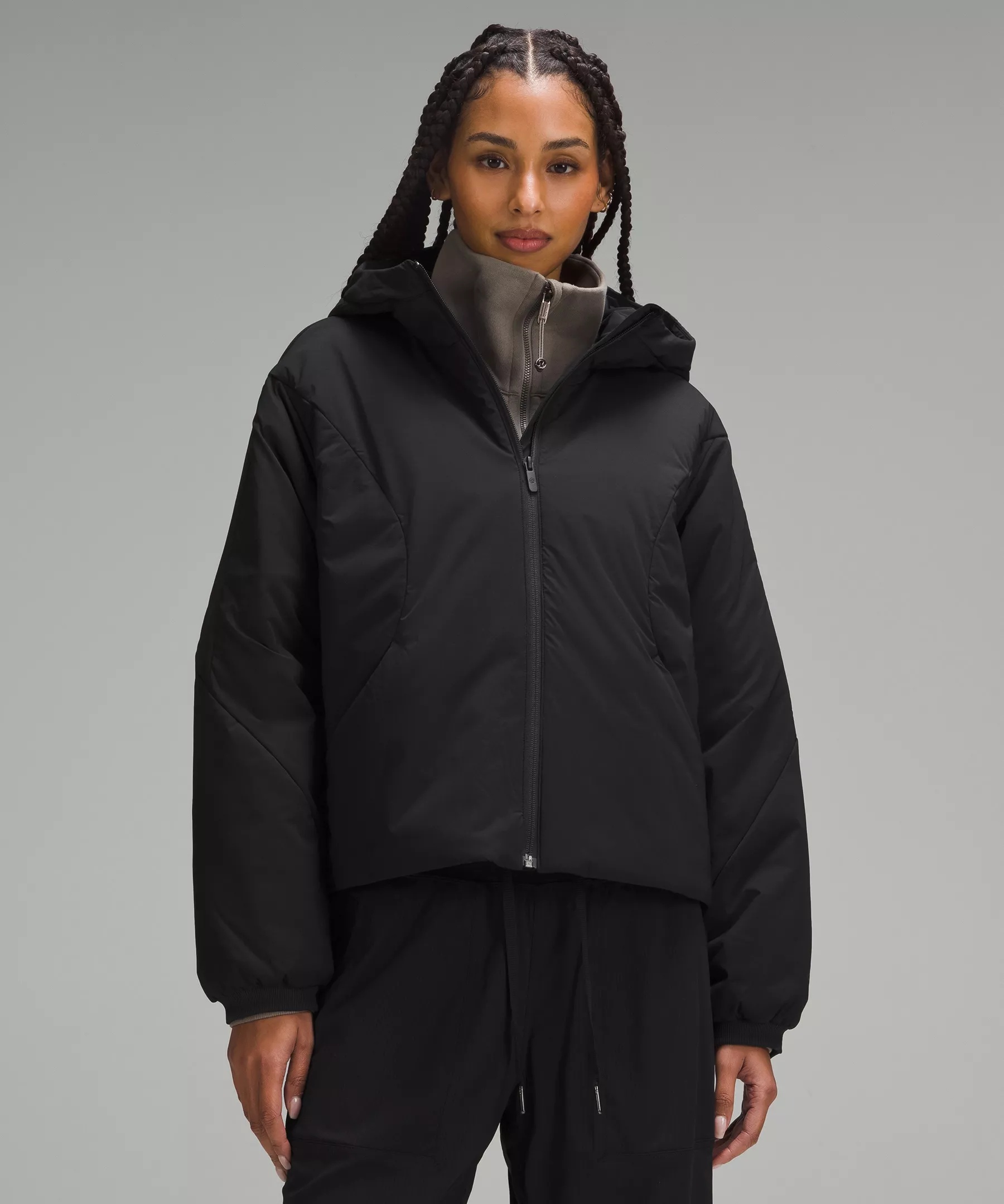 Water-Resistant, Glyde™ Fabric Water-resistant Lightweight Abrasion-resistant Wind-resistant Two-way stretch PrimaLoft® insulation is warm, even when wet This product contains recycled polyester made from repurposed plastic waste Oversized Fit, High-Hip Length Oversized fit is purposefully large with exaggerated proportions. Size down if you prefer a slimmer fit Product Features Zippered hand pockets with hidden phone sleeve Hem cinch allows you to choose your fit Material and care Materials Body filling: 100% Recycled polyester Cuff: 82% Nylon18% Lycra® elastane Lining: 100% Recycled polyester Body: 94% Recycled nylon6% Elastane Care Wash with like colours Machine wash cold Do not bleach Tumble dry low Do not iron Do not dry clean Imported