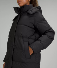 Water-Repellent, SoftMatte™ Fabric Water-repellent Windproof 600-fill-power goose down insulates through extra loft 100% of our down is certified to the Responsible Down Standard (RDS) by Control Union (No. 847515) This product contains recycled polyester made from repurposed plastic waste Relaxed Fit, Calf Length Relaxed fit feels roomy and can be worn over larger layers. Size down if you prefer a slimmer fit Product Features Removable hood Cinch the interior waist drawcord to customize your fit Zippered hand pockets with a hidden phone sleeve Interior pockets hold the essentials Close-fitting interior cuffs help hold in heat Two-way zipper Material and care Materials Cuff: 57% Nylon24% Polyester19% Lycra® elastane Trim filling: 75% Recycled polyester25% Polyester Pocket lining: 100% Polyester Filling: 80% Grey goose down20% Grey Goose Feathers Lining: 100% Polyester Body: 100% Recycled polyester Care Wash with like colours Machine wash cold Do not bleach Tumble dry low Do not iron Do not dry clean Imported