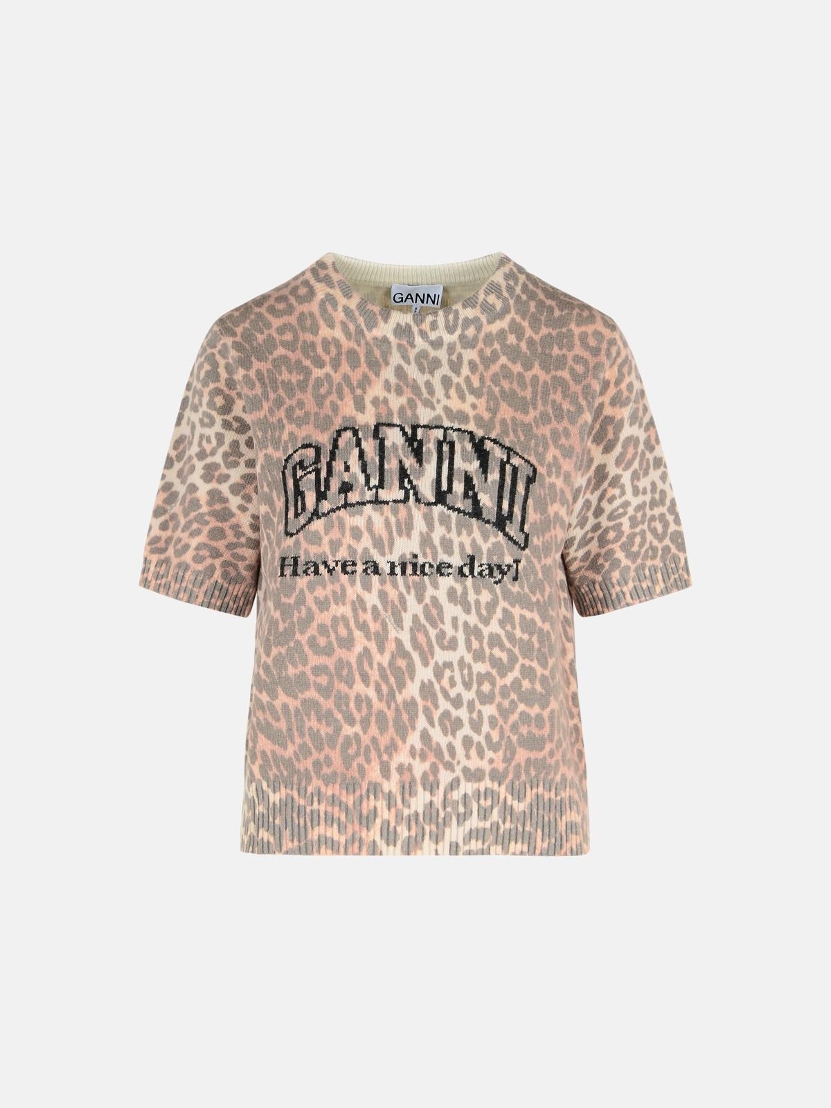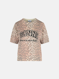 Manufacture code: K2500 943 Retail code: K2500 943 Leopard print design, short sleeves, ribbed trims, 'GANNI' logo, 'Have a nice day! Please recycle' message Main: 80% calf leather, 20% nylon Made in Italy