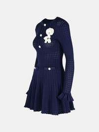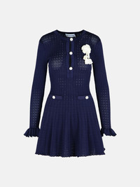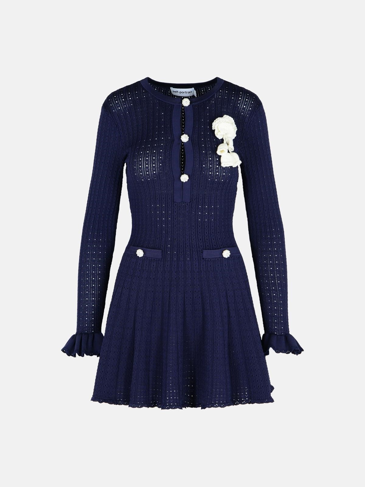 Navy Pointelle Knit Crochet Flower Mini Dress