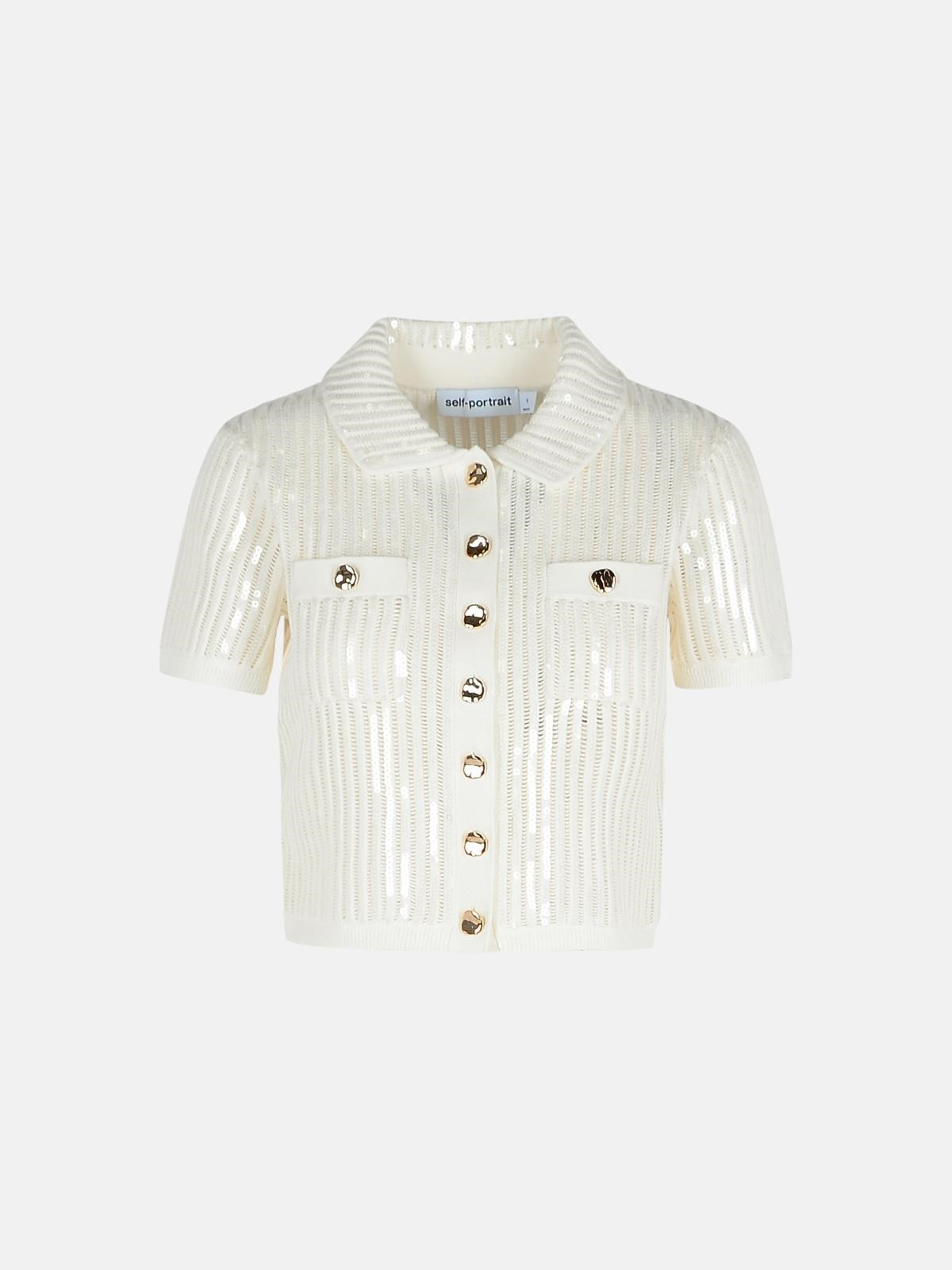 Manufacture code: SS25-126T-W WHITE Retail code: SS25-126T-W WHITE Knitted texture, two front pockets, tone-on-tone sequins, ornamental buttons Main: 96% cotton, 4% cashmere Made in China