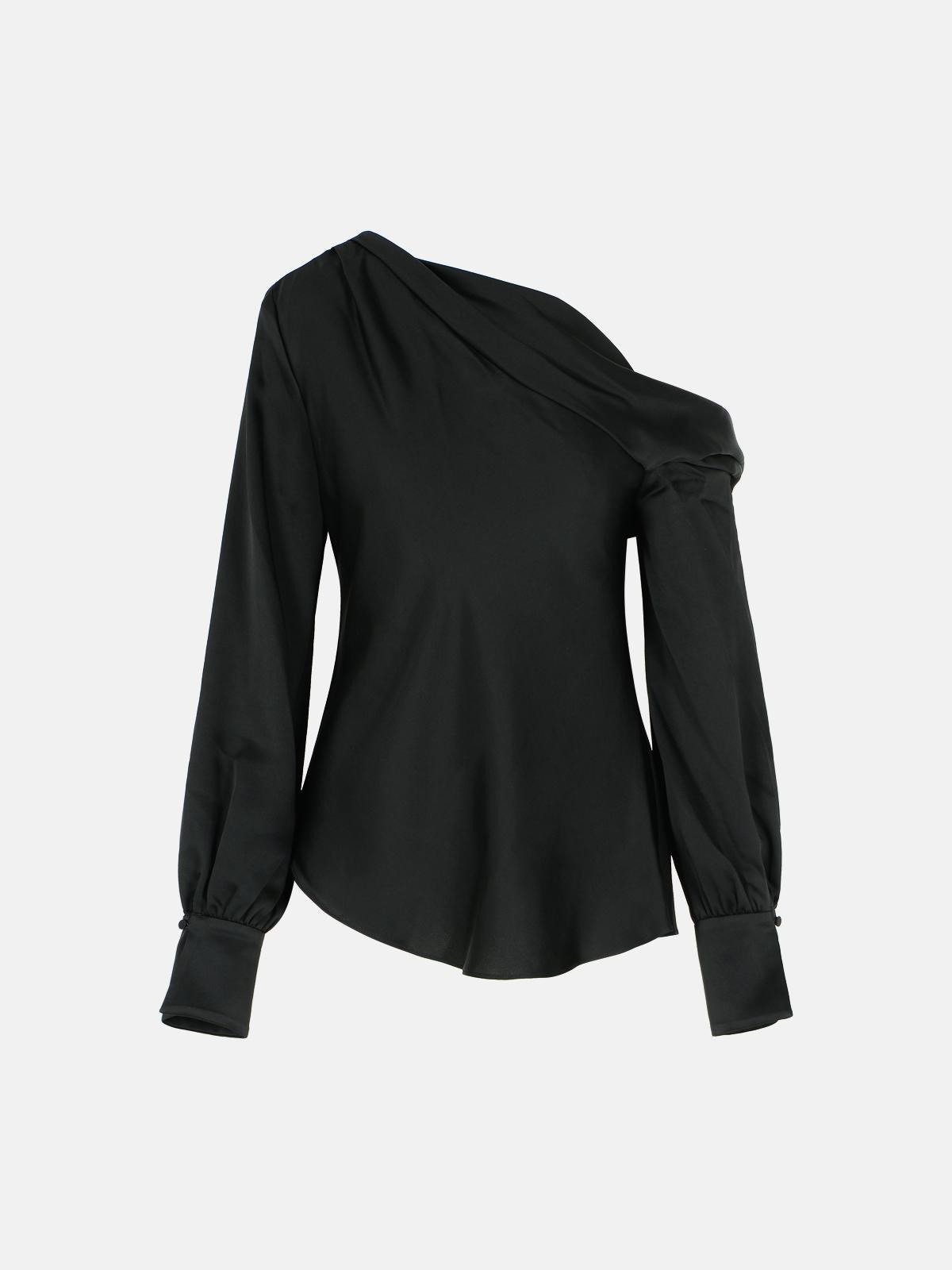 Manufacture code: SI-2081-Q BLACK Retail code: SI-2081-Q BLACK Made of polished satin, draped, asymmetrical neckline with bare shoulder, button cuffs, asymmetrical hem Main: 89% acetate, 11% polyester Made in China
