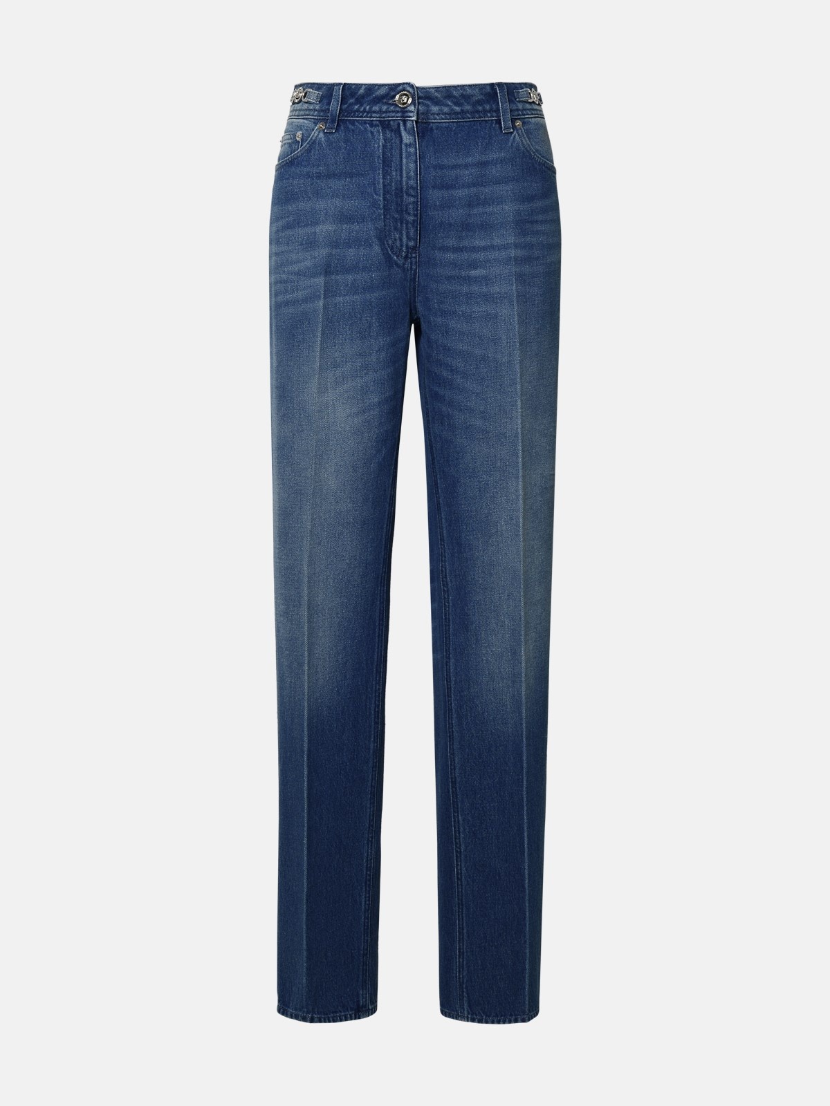 Manufacture code: 1012634 1A07079 1D030 Retail code: 1012634 1A07079 1D030 Medium wash jeans made of cotton denim with tailored front pleat, straight leg cut, 'Medusa '95' customization at the waist, 'Medusa' button and zip closure, five pockets, leather label with logo embossed at the waist on the back Material: 100% cotton Made in Italy