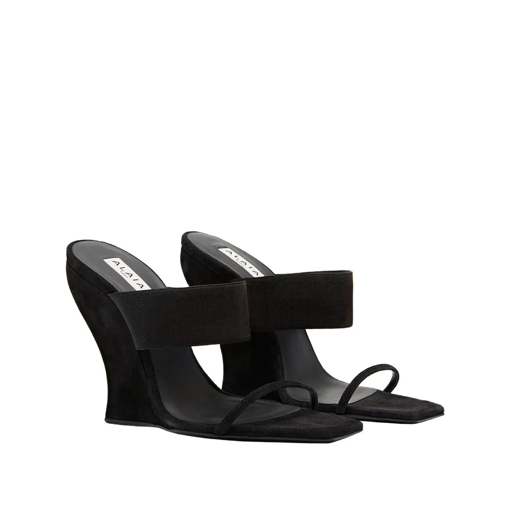 black curved wedge square toe 110mm heel toe strap slip-on styleMADE IN:ItalyMATERIAL:Lining Composition Calf Leather: 100.0%, Sole Composition Calf Leather: 100.0%, Outer Composition Calf Suede: 100.0%COLOR:BLACK SKU: AA3S3005C0H53999 Our Products Are 100% Genuine. In All Cases We Stand By The Authenticity Of Every Product Sold On Our Site. All sales are final and we only accept returns for quality issue. Buyer is responsible for any import tax/duty if applicable.