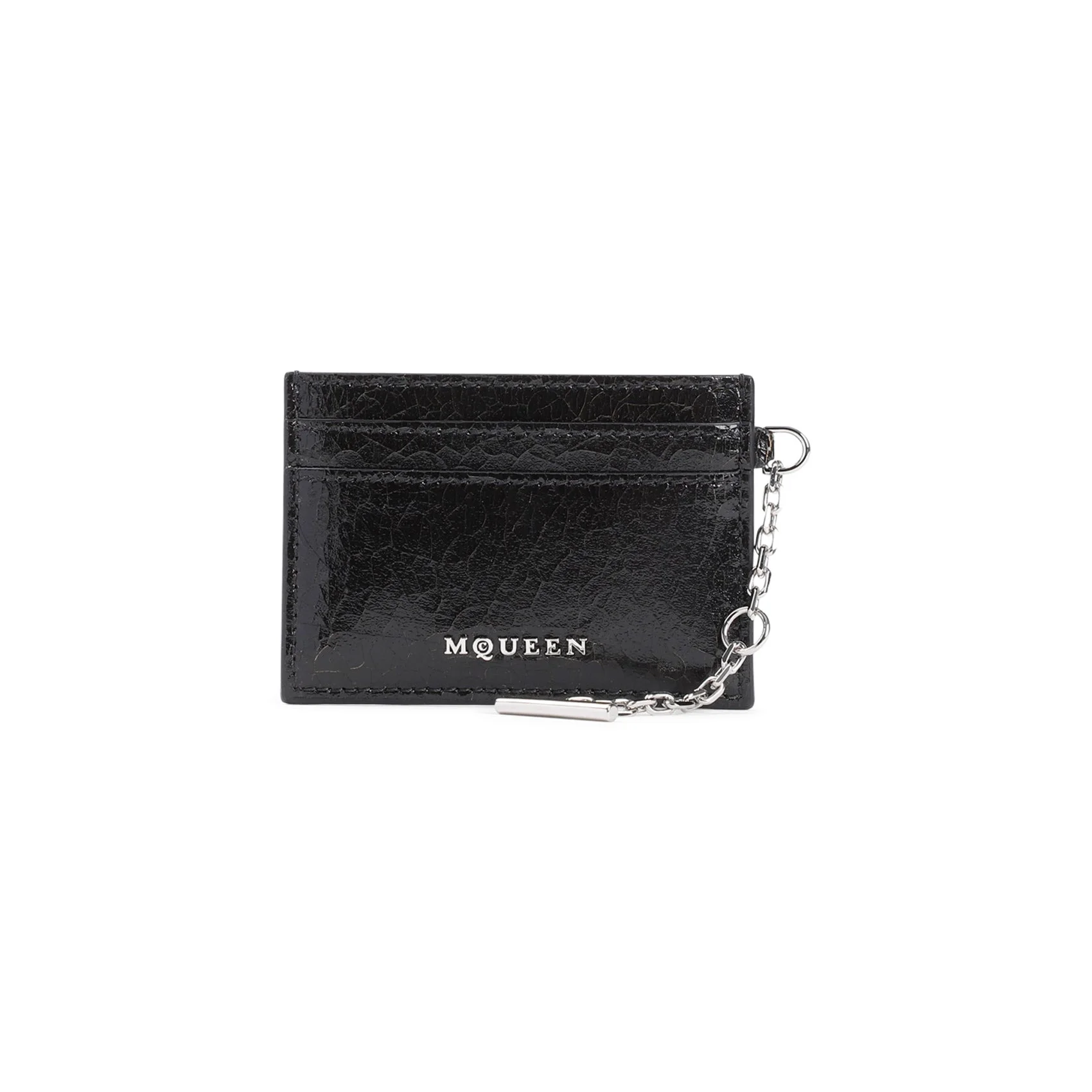 Alexander McQueen Black Leather Sling Card Holder. Black crackle leather, silver-toned hardware, metal logo on the front, side chain with a cross-bar, four credit card slots and one central compartment. Leather | 100%LEATHER W:10cm H:7cm D:0,5cm Size Type: One Size SKU: 8050631AAUEBlack Our Products Are 100% Genuine. In All Cases We Stand By The Authenticity Of Every Product Sold On Our Site. All sales are final and we only accept returns for quality issue. Buyer is responsible for any import tax/duty if applicable.