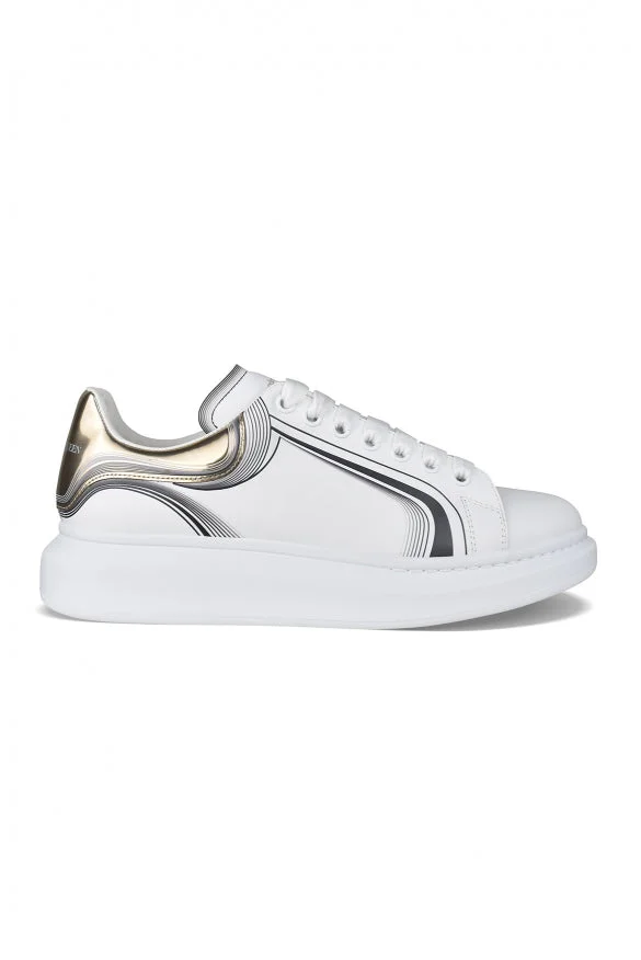 Alexander McQueen Oversize sneakers in smooth white calf leather. Shiny gold leather counter. Curve Tech print on sides, heel counter. Logo on counter and tongue. White flat laces. White oversize sole. 100% calf leather. Made in Italy. Size Type: IT SKU: 750336WIDJP8834 Our Products Are 100% Genuine. In All Cases We Stand By The Authenticity Of Every Product Sold On Our Site. All sales are final and we only accept returns for quality issue. Buyer is responsible for any import tax/duty if applicable.