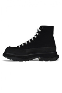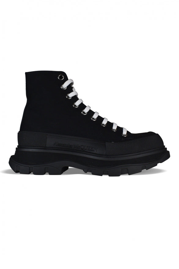 Alexander McQueen Tread Slick high sneakers. Black canvas. Round toe with rubber insert. Logo on heel and tongue. White flat lace-up closure. Oversized black rubber outsole with signature. Made in Italy. Size Type: IT SKU: 604254W4MV21000 Our Products Are 100% Genuine. In All Cases We Stand By The Authenticity Of Every Product Sold On Our Site. All sales are final and we only accept returns for quality issue. Buyer is responsible for any import tax/duty if applicable.