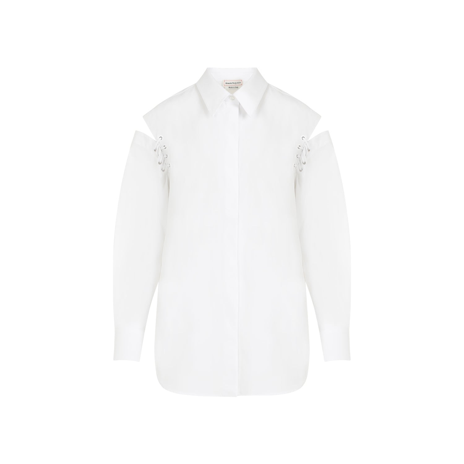 Alexander McQueen Optical White Cotton Shirt. Pure optical white cotton shirt, pointed collar, front buttoned fastening, long sleeves, cut-out details on the shoulders with tonal laces, buttoned cuffs, round hem. Cotton | 100%COTTON Size Type: IT SKU: 790908QAAADWhite Our Products Are 100% Genuine. In All Cases We Stand By The Authenticity Of Every Product Sold On Our Site. All sales are final and we only accept returns for quality issue. Buyer is responsible for any import tax/duty if applicable.
