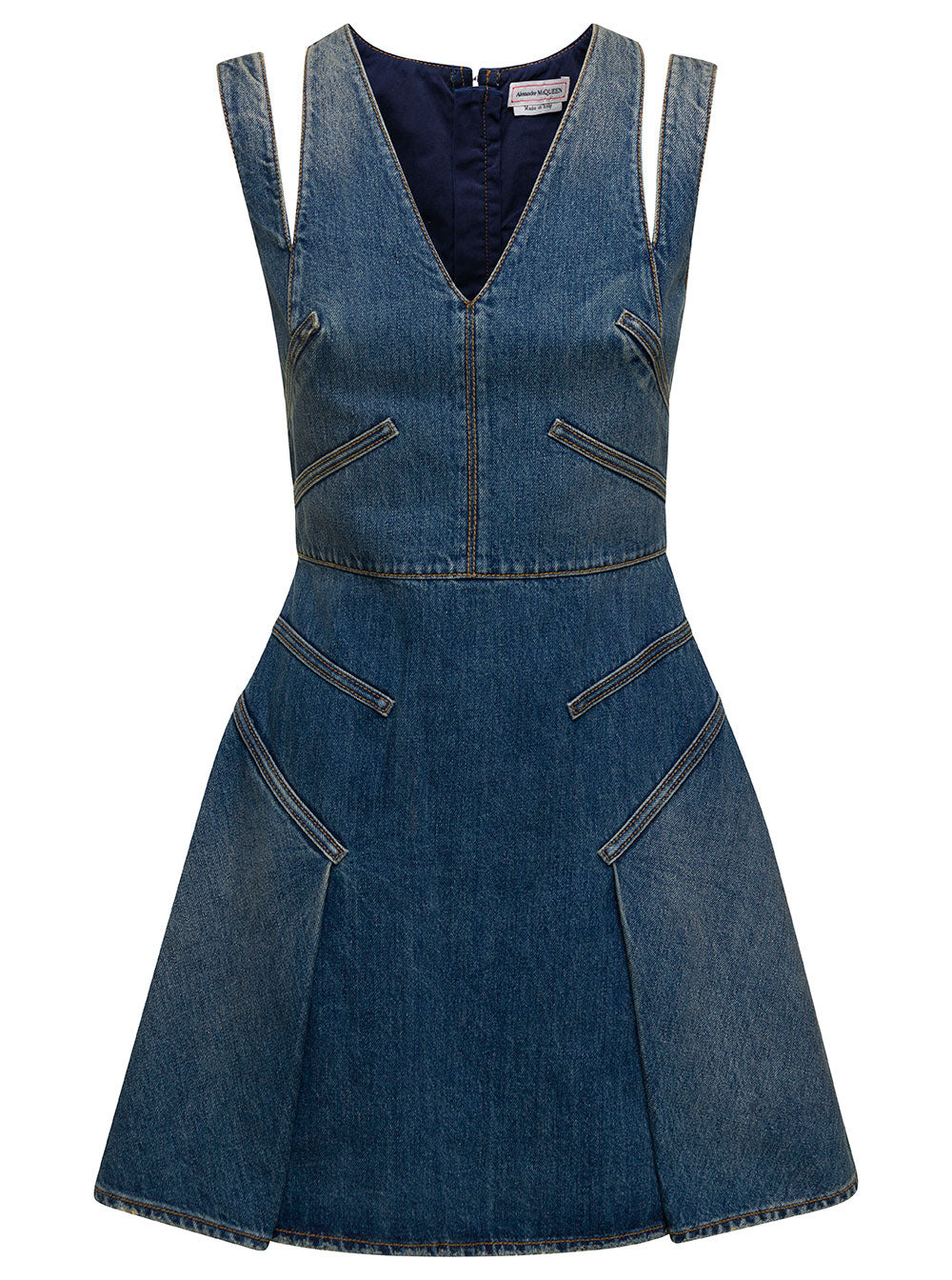 Alexander Mcqueen Women Blue Mini Dress With Cut-Out Detail And Pleated Skirt In Cotton Denim Woman