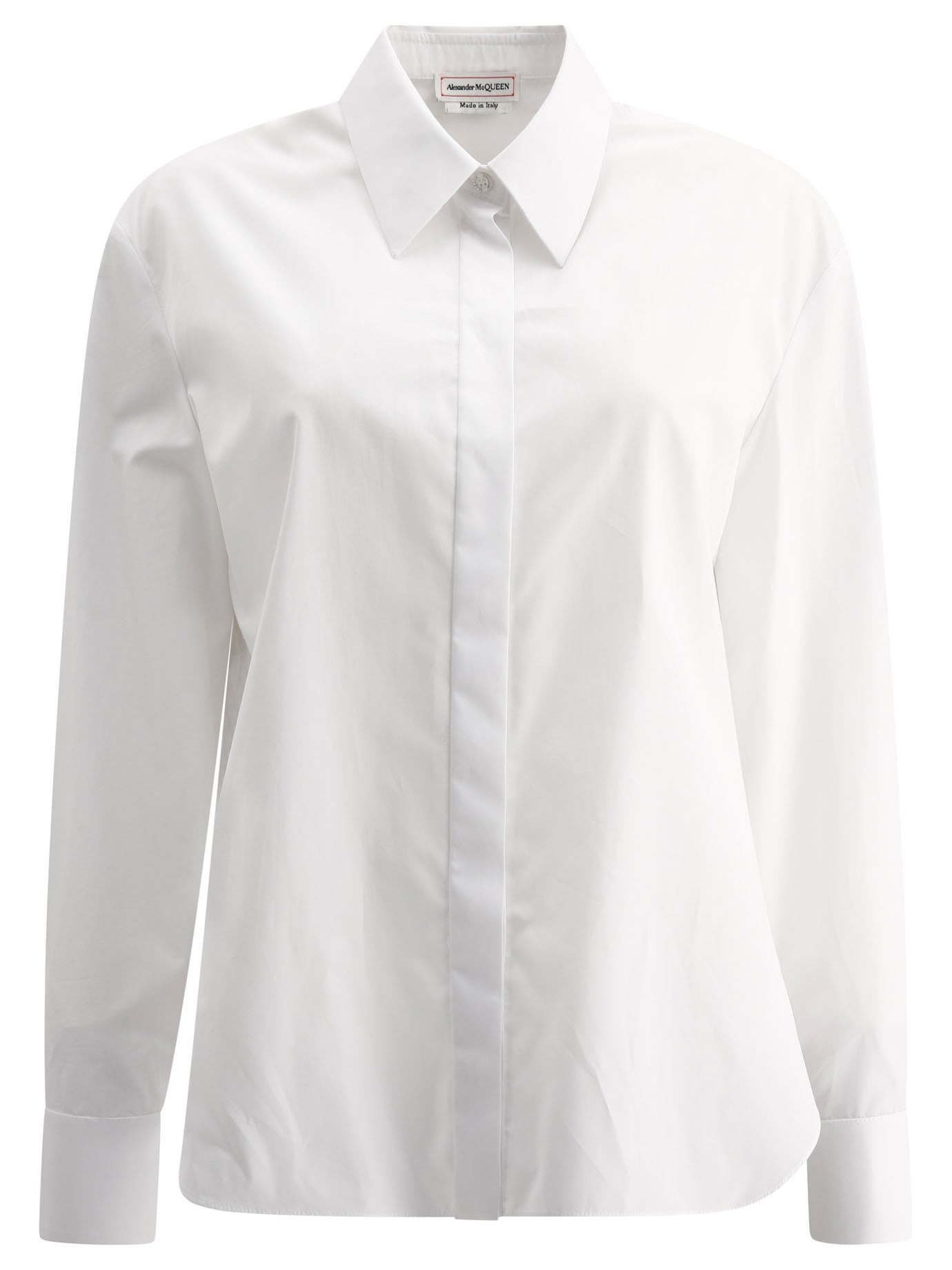 Alexander McQueen's classic shirt represents the essence of contemporary elegance. Made of optical white cotton poplin, this shirt is designed for the sophisticated woman who appreciates refined details and an impeccable fit. The clean design and solid color make it a versatile garment, suitable for both the office and special occasions.|| - Italian collar - Regular fit - Long sleeves - Round hem - Hidden button closure on the front ||For a flawless look, pair it with a pair of black cigarette pants and leather pumps. Complete your outfit with a stylish shoulder bag and minimal earrings for an extra touch of class. 100% cotton SKU: 767940QAAAD9000 Our Products Are 100% Genuine. In All Cases We Stand By The Authenticity Of Every Product Sold On Our Site. All sales are final and we only accept returns for quality issue. Buyer is responsible for any import tax/duty if applicable.