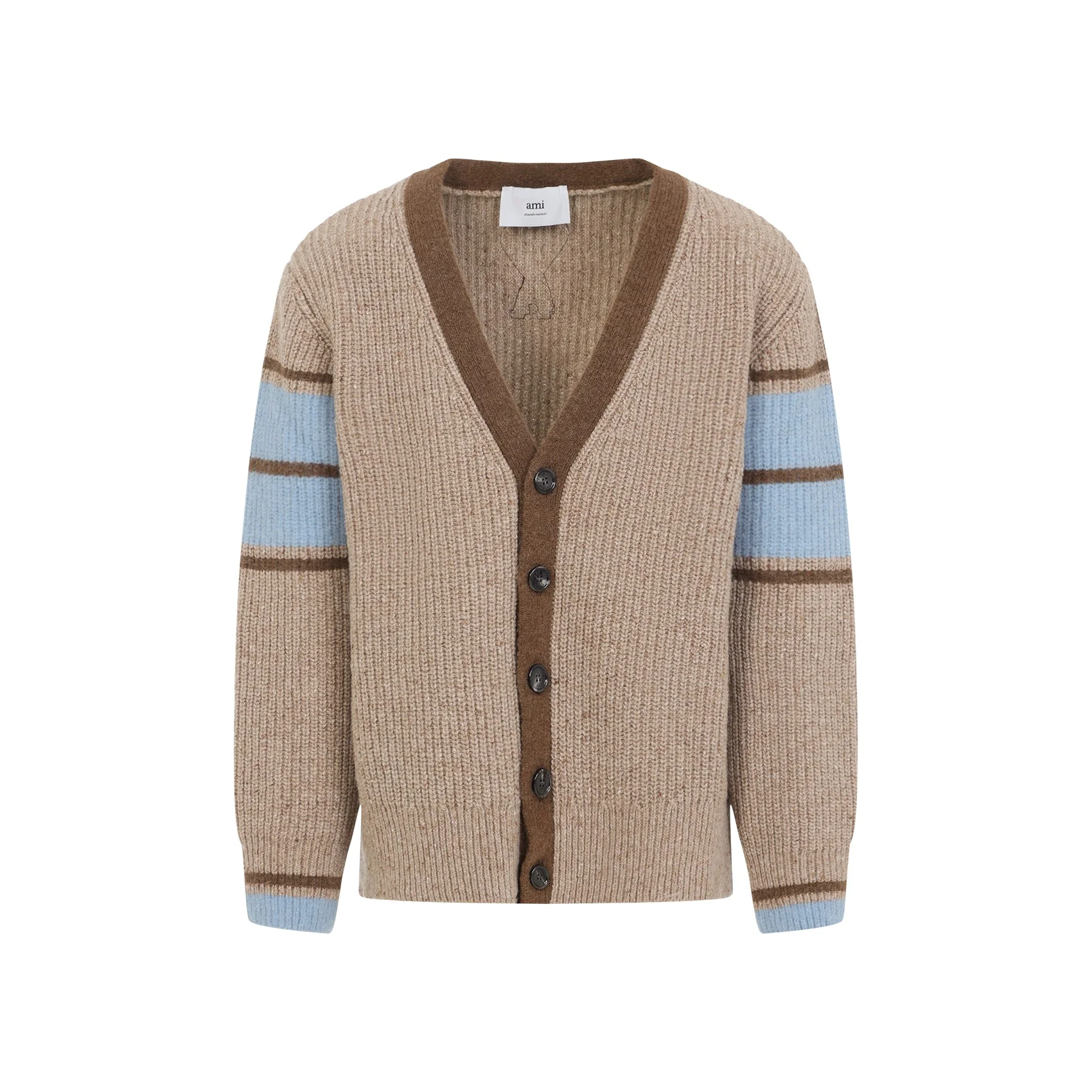 Ami Camel Beige Wool College Cardigan. Pure wool cardigan, V-neck, front buttoned fastening, back patch logo, long sleeves, ribbed cuffs, straight hem, knitted design. Brown edges, light blue details on the sleeves. Wool | 100%WOOL Size Type: INT SKU: HKC358KN0111Brown Our Products Are 100% Genuine. In All Cases We Stand By The Authenticity Of Every Product Sold On Our Site. All sales are final and we only accept returns for quality issue. Buyer is responsible for any import tax/duty if applicable.