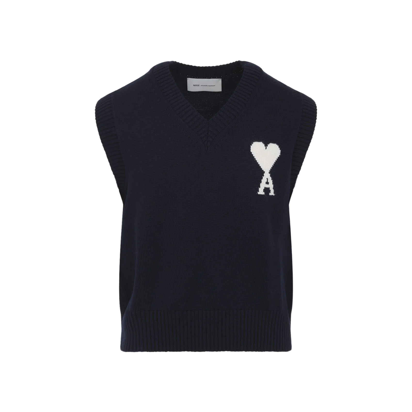 Ami Blue Wool and Cotton Vest. Crafted from blue virgin wool and cotton blend, featuring a V-neckline, a sleeveless construction, a contrasting logo inlay on the chest, and ribbed edges. Wool | 53%VIRGIN WOOL 47%COTTON Size Type: INT SKU: UKS860KN0156Blue Our Products Are 100% Genuine. In All Cases We Stand By The Authenticity Of Every Product Sold On Our Site. All sales are final and we only accept returns for quality issue. Buyer is responsible for any import tax/duty if applicable.