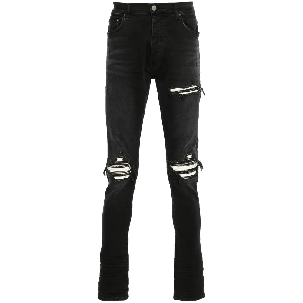 black cotton blend washed denim ripped detailing suede trim skinny cut belt loops classic five pockets logo patch to the rear silver-tone logo plaque to the rear button fly fasteningMADE IN:United StatesMATERIAL:Cotton: 92.0%, Polyester: 70.0%, Polyurethane: 30.0%, Elastane: 2.0%, Elastomultiester: 6.0%COLOR:BLACK SKU: AMDNSY1055VINBK Our Products Are 100% Genuine. In All Cases We Stand By The Authenticity Of Every Product Sold On Our Site. All sales are final and we only accept returns for quality issue. Buyer is responsible for any import tax/duty if applicable.
