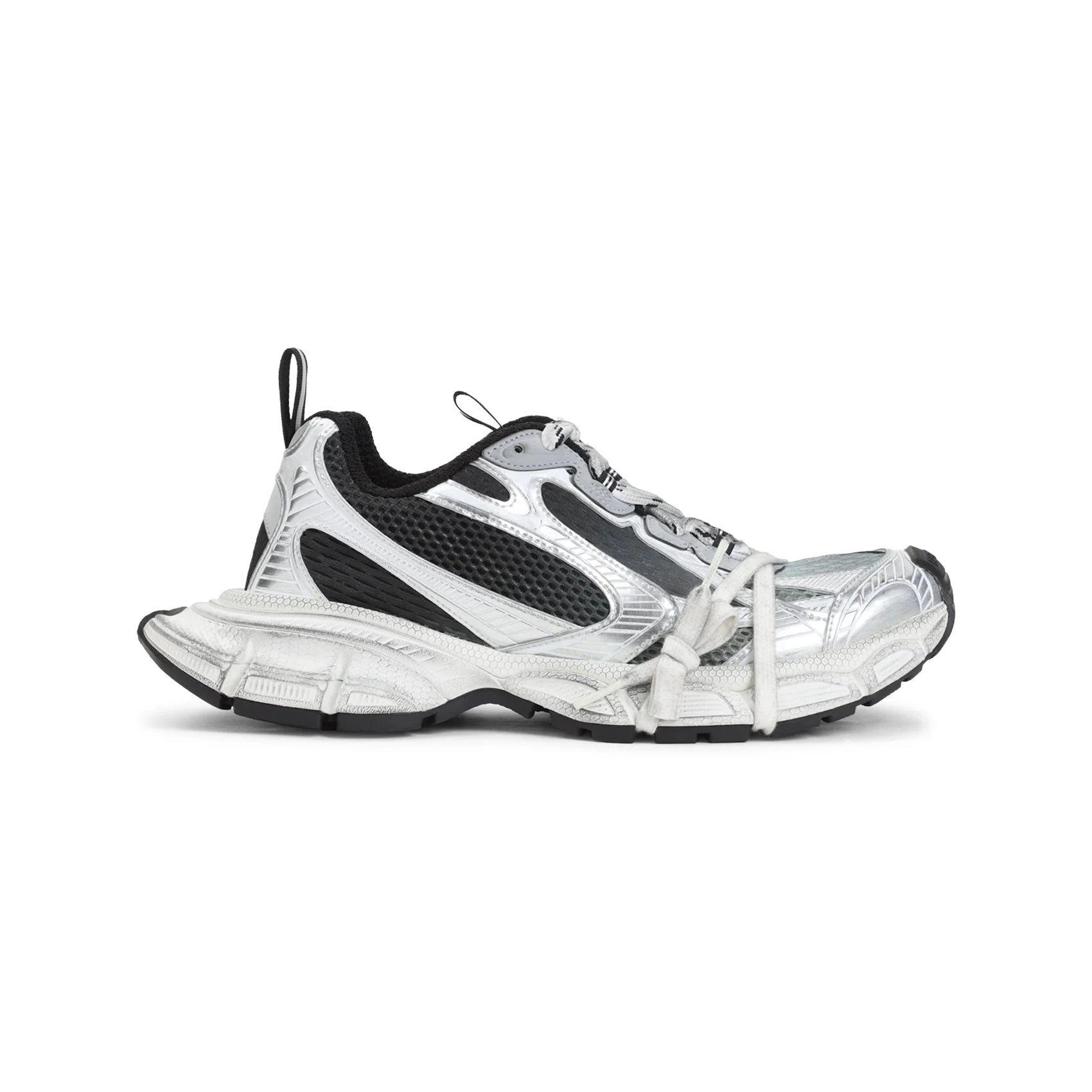 Balenciaga 3XL Black Grey and White Textile Sneakers. Crafted from black mesh and silver polyurethane inserts, featuring an all-over worn-out effect, a round toe with logo and embossed size marking, lace-up fastening, a pull-on tab on the tongue and at the heel, logo detail on the side, textile padded lining, branded insole, and rubber outsole. Detachable and decorative extra lace tied around the shoes. | 100%TEXTILE 10%LEATHER 100%RUBBER Size Type: IT SKU: 734734W3XGMMulticolour Our Products Are 100% Genuine. In All Cases We Stand By The Authenticity Of Every Product Sold On Our Site. All sales are final and we only accept returns for quality issue. Buyer is responsible for any import tax/duty if applicable.
