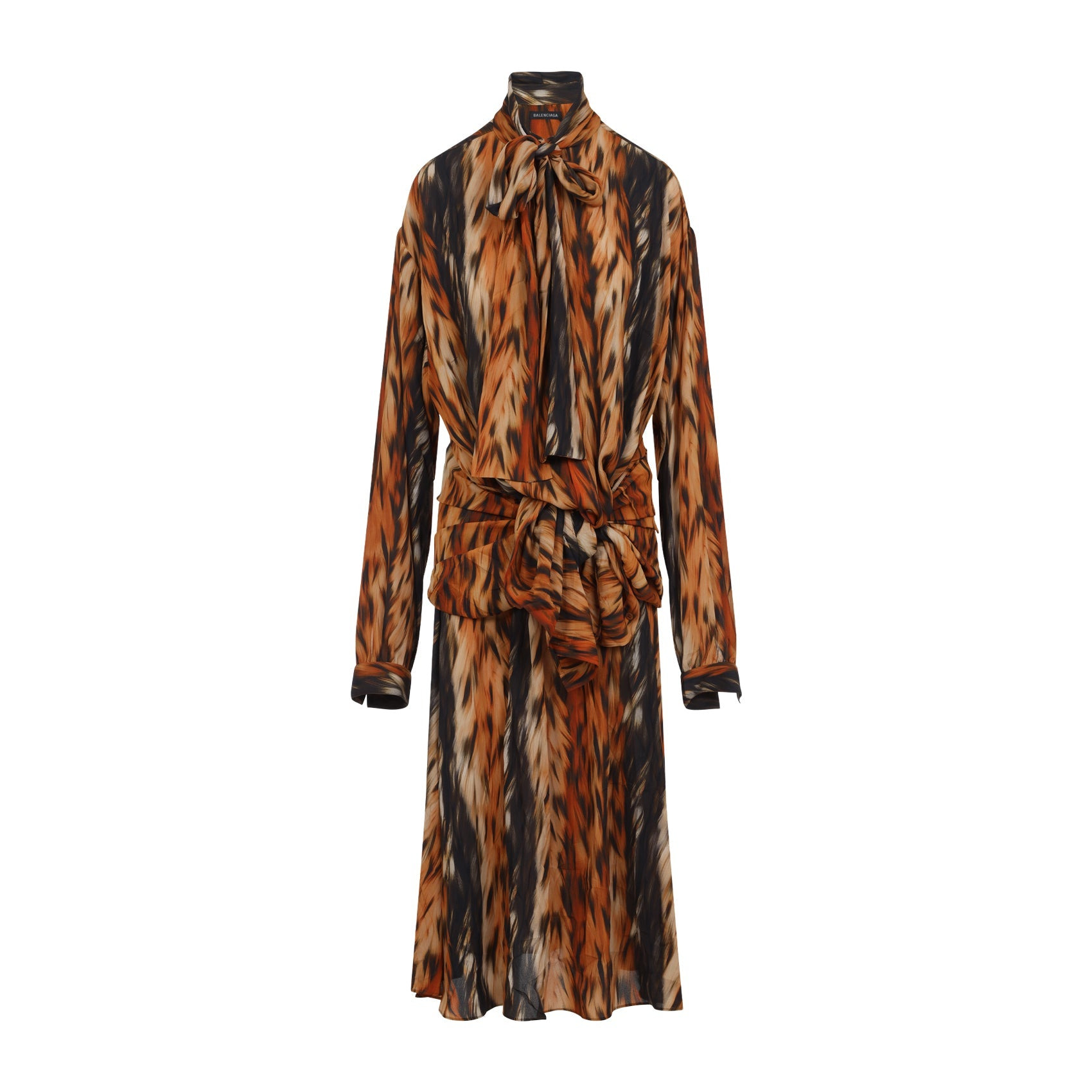 Balenciaga Brown Knotted Dress. Crafted in polyester fabric, stand-up collar, front bow detail, waist knotted, tonal belt, dropped shoulders, long sleeves, buttoned cuffs, midi-length, straight hem, draped effect. Brown and black animal design. Polyester | 100%POLYESTER Size Type: FR SKU: 814346TRLD7Brown Our Products Are 100% Genuine. In All Cases We Stand By The Authenticity Of Every Product Sold On Our Site. All sales are final and we only accept returns for quality issue. Buyer is responsible for any import tax/duty if applicable.