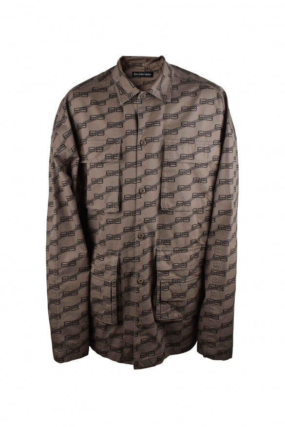 Balenciaga beige cargo shirt. Brown BB logo printed diagonally throughout. Button closure. 4 front pockets. Classic lapel collar. Long sleeves. 100% cotton. Made in Italy. Size Type: INT SKU: 704390TML349378 Our Products Are 100% Genuine. In All Cases We Stand By The Authenticity Of Every Product Sold On Our Site. All sales are final and we only accept returns for quality issue. Buyer is responsible for any import tax/duty if applicable.