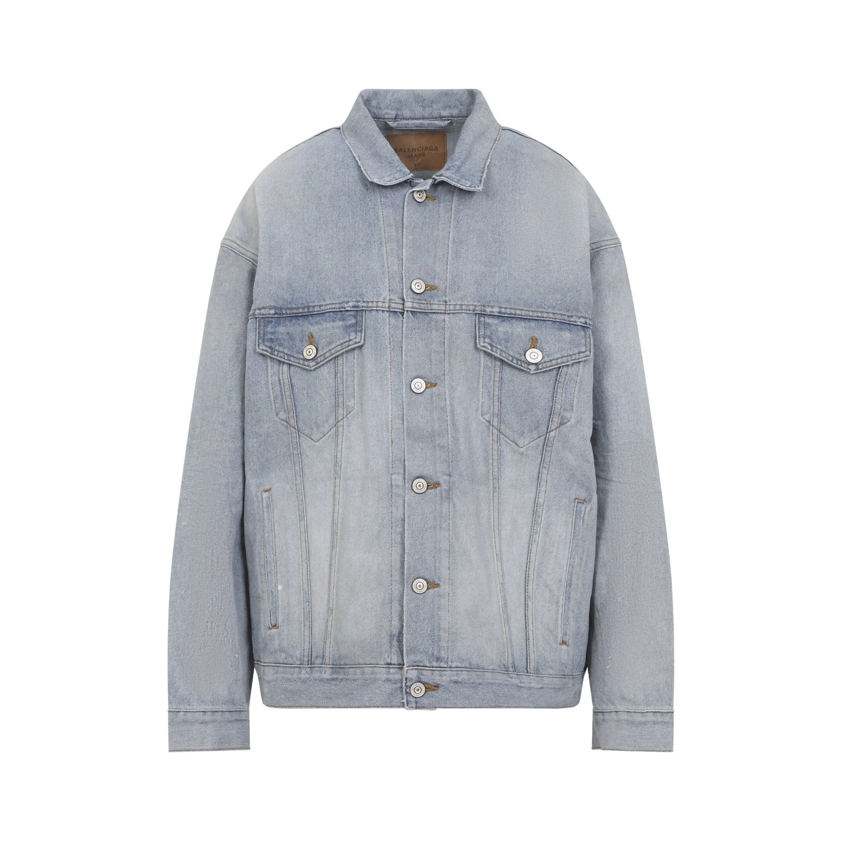 Balenciaga Dirty Light Blue Cotton Regular Jacket. Pure dirty light blue cotton jacket, pointed collar, front buttoned fastening, chest flap buttoned pockets, back white design with white lettering logo, dropped shoulders, long sleeves, buttoned cuffs, straight hem. Cotton | 100%COTTON Size Type: INT SKU: 861410TTWB1Blue Our Products Are 100% Genuine. In All Cases We Stand By The Authenticity Of Every Product Sold On Our Site. All sales are final and we only accept returns for quality issue. Buyer is responsible for any import tax/duty if applicable.