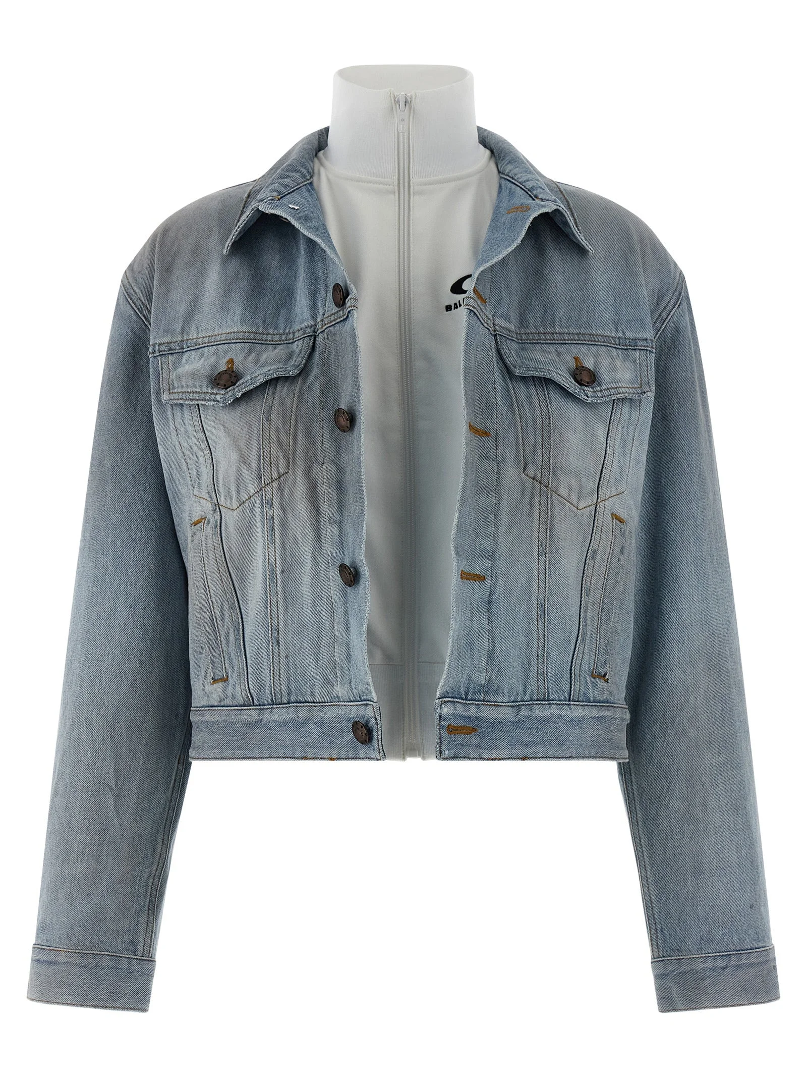 Stonewashed cotton denim jacket with stained and used effect, crop model, front double layer detail with high neck bib and cotton zip closure, contrast stitching, shirt collar, front button closure, pockets, long cuffed sleeves, cotton lining. true to size fit 100% cotton SKU: 849904TTW744200 Our Products Are 100% Genuine. In All Cases We Stand By The Authenticity Of Every Product Sold On Our Site. All sales are final and we only accept returns for quality issue. Buyer is responsible for any import tax/duty if applicable.