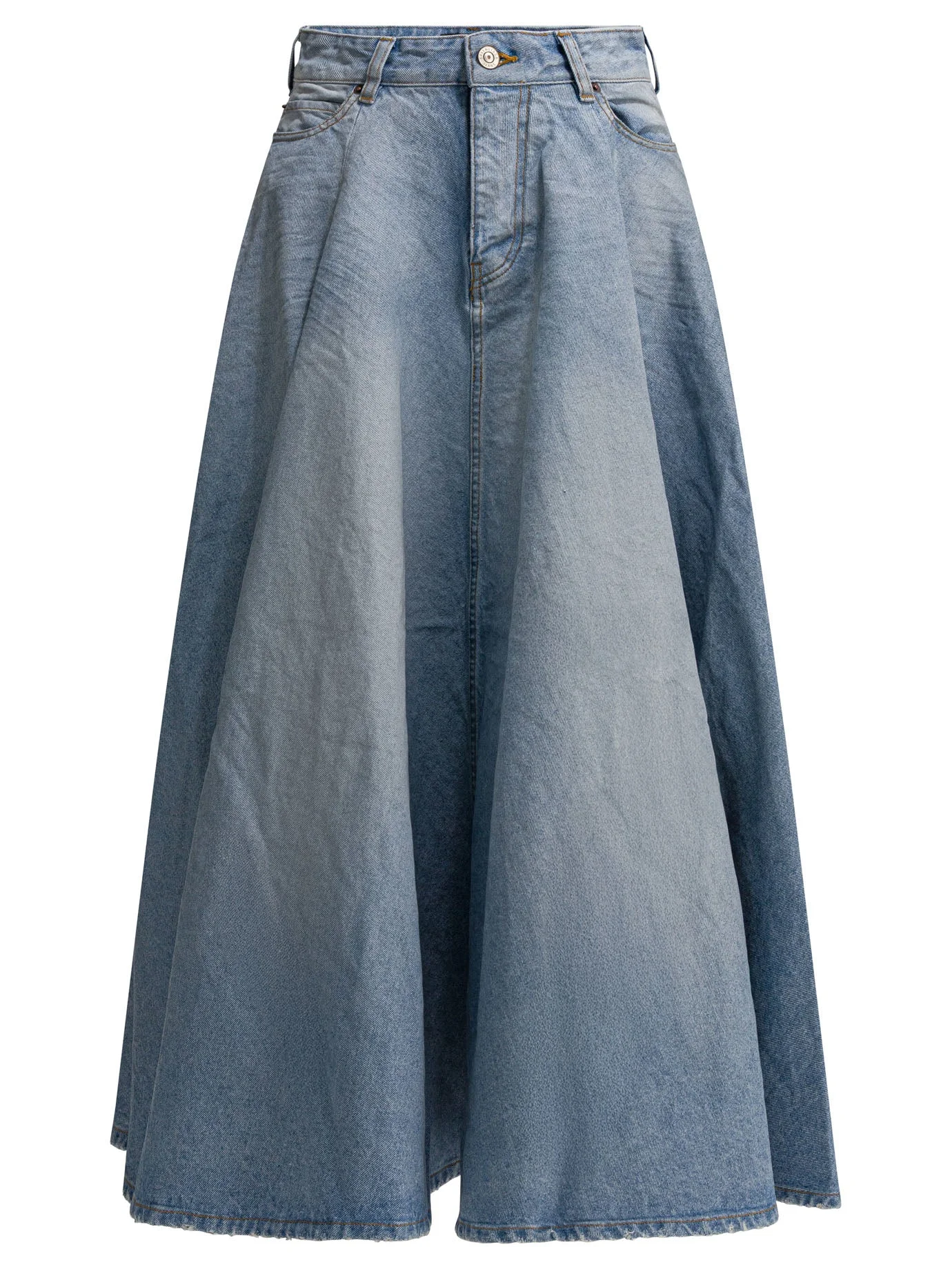 Balenciaga "Godet" long skirt made of cotton denim with a mid-waist construction and soft flared silhouette at the bottom. The construction features godet detail, essential stitching, and washed finish with worn effect. The closure features a covered zipper flap. The top includes five belt loops and five-pocket configuration. On the back is applied Balenciaga Jeans patch. || - Solid color - Cotton denim - Washed and worn effect - High-rise waist - Covered zipper flap - 5 belt loops - 5 pockets - Balenciaga Jeans patch on the back - Godet bottom - Regular fit 100% cotton SKU: 856906TTWBI4009 Our Products Are 100% Genuine. In All Cases We Stand By The Authenticity Of Every Product Sold On Our Site. All sales are final and we only accept returns for quality issue. Buyer is responsible for any import tax/duty if applicable.