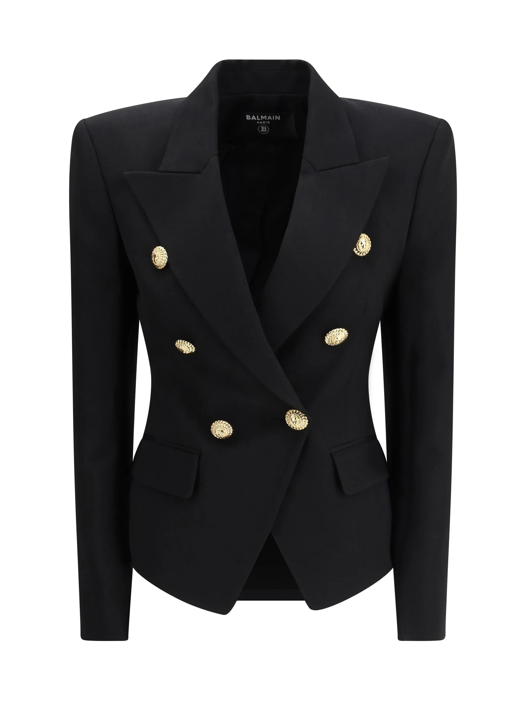 The Jacket by Balmain expresses the grain de poudre fabric through a precise, sculpted structure designed to enhance the body’s line with confident elegance. The Italian tailored collar and structured shoulders create an iconic presence, while the crossed front with six buttons, five of which are decorative, adds character with refined balance. The “Lion double chain” metal buttons enrich the piece with a distinctive accent. The flap welt pockets at the sides and the internal welt pocket integrate seamlessly into the construction, supported by the serge lining. The fitted cut, narrowed at the waist, shapes a silhouette that feels contemporary and assured. Size Type: FR SKU: GF1SI505WC090PA Our Products Are 100% Genuine. In All Cases We Stand By The Authenticity Of Every Product Sold On Our Site. All sales are final and we only accept returns for quality issue. Buyer is responsible for any import tax/duty if applicable.