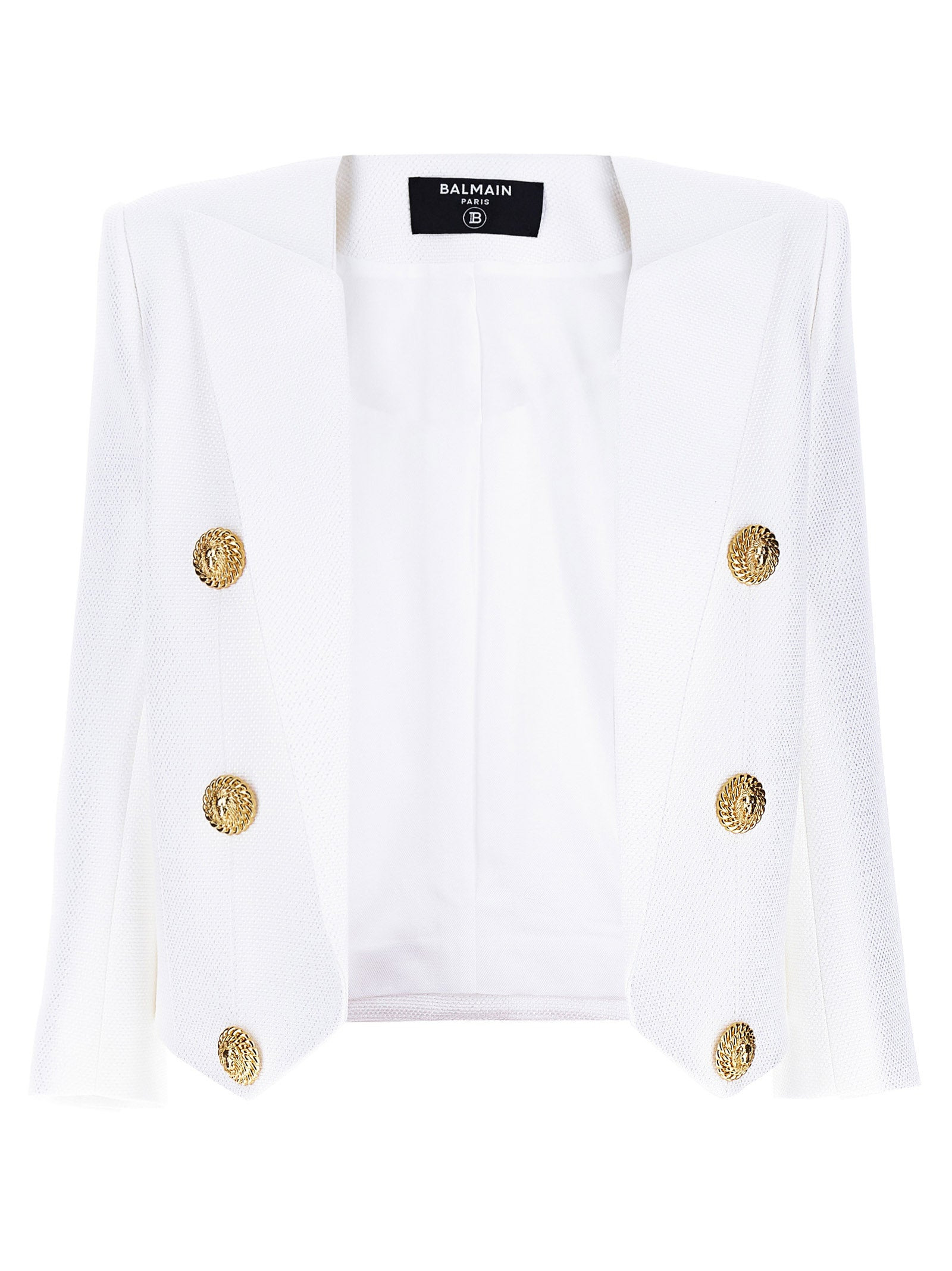 Viscose blazer with 'Leone doppia catena' logo buttons, round neckline with cut-out Italian tailored collar, Spencer style peak lapels, padded structured shoulders, 3/4 sleeves. true to size fit French size 98% viscose, 2% polyamide SKU: EF1SC225VF210FB Our Products Are 100% Genuine. In All Cases We Stand By The Authenticity Of Every Product Sold On Our Site. All sales are final and we only accept returns for quality issue. Buyer is responsible for any import tax/duty if applicable.