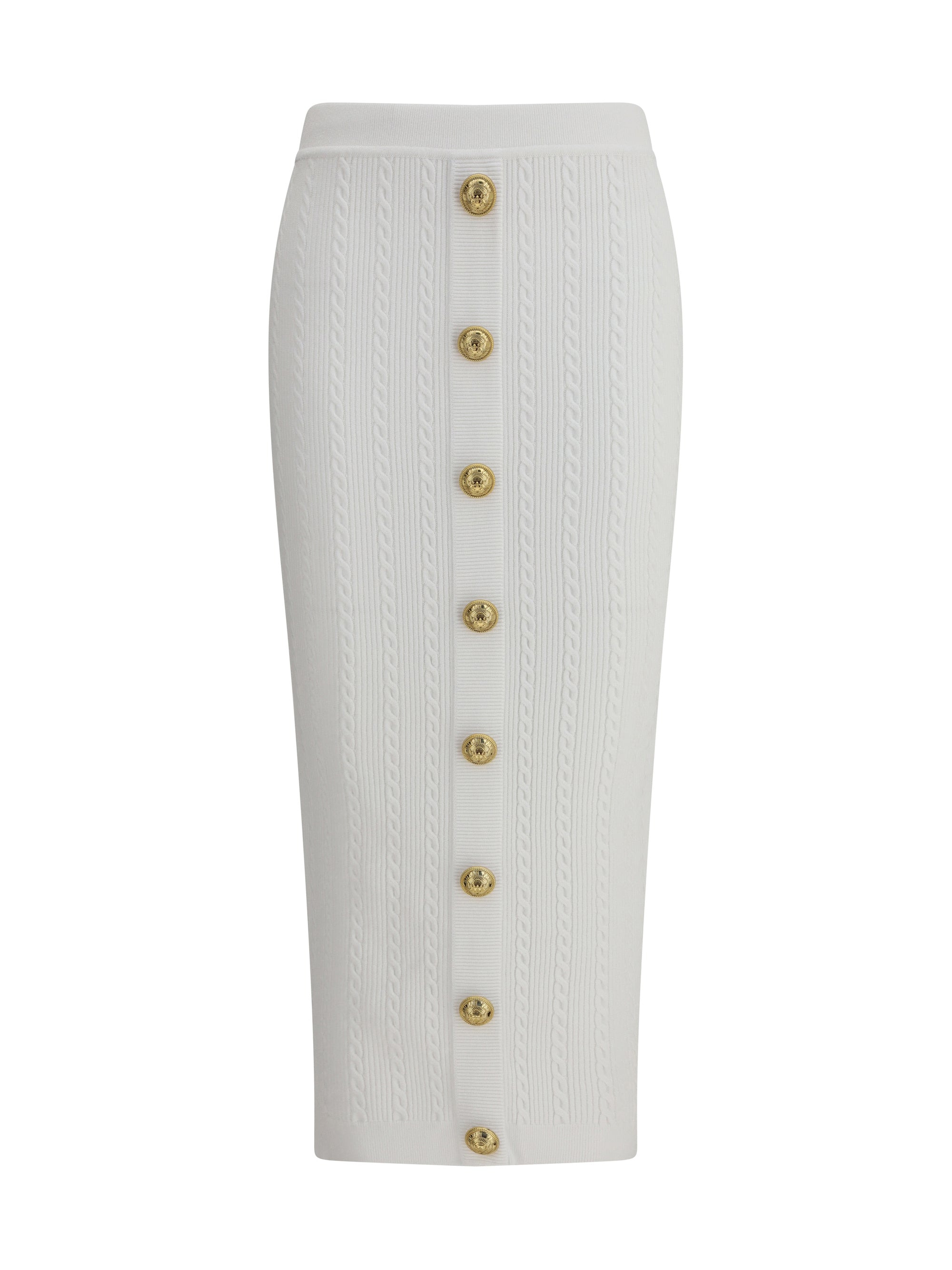 Balmain's midi Skirt enhances the silhouette with a ribbed and twisted knit, giving structure and movement to the garment. On the front, the characteristic decorative "Coin" buttons in gold metal, the house's iconic signature, stand out. The back closure is entrusted to an exposed double zipper in gold metal, with sliders engraved "Balmain Paris." Contrasting ribbed trim completes the design for a sophisticated and recognizable look. Size Type: FR SKU: FF1LD066KI500FA Our Products Are 100% Genuine. In All Cases We Stand By The Authenticity Of Every Product Sold On Our Site. All sales are final and we only accept returns for quality issue. Buyer is responsible for any import tax/duty if applicable.