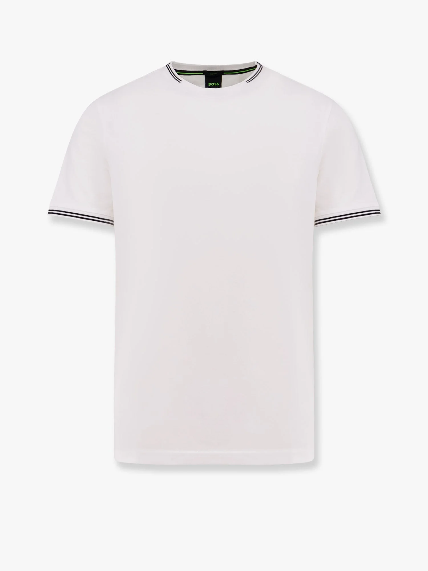Brand: BOSS Product reference:50521245 Color reference:100 Color:WHITE Season:26P Gender:Man Category 1:Abbigliamento Category 2:T-Shirts and TopMade in: Crew-neck Contrasting ribbed profiles Short sleeve Lettering logo on the front 92% cotton 8% elastane SKU: 50521245_100 Size Type: INT SKU: 5052124500 Our Products Are 100% Genuine. In All Cases We Stand By The Authenticity Of Every Product Sold On Our Site. All sales are final and we only accept returns for quality issue. Buyer is responsible for any import tax/duty if applicable.