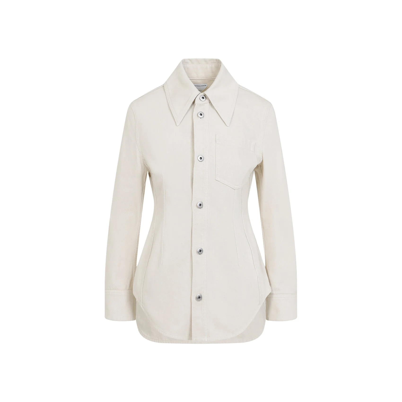 Bottega Veneta Ivory Cotton Jacket. Crafted from ivory cotton denim, pointed collar, front button fastening, fitted waist, long sleeves, buttoned cuffs, round hem. Cotton | 100%COTTON Size Type: IT SKU: 829180V5DV0Nude&Neutrals Our Products Are 100% Genuine. In All Cases We Stand By The Authenticity Of Every Product Sold On Our Site. All sales are final and we only accept returns for quality issue. Buyer is responsible for any import tax/duty if applicable.