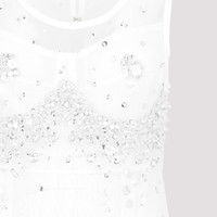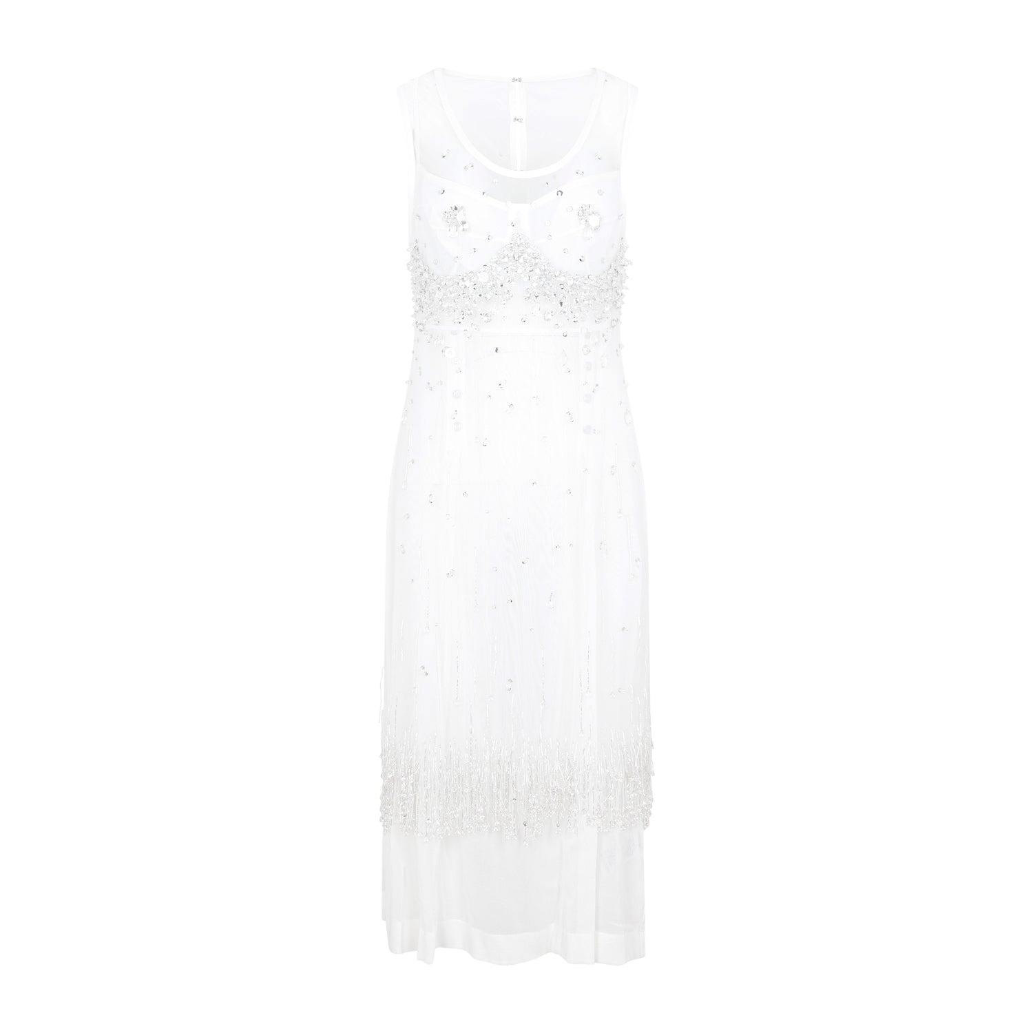 Bottega Veneta White Crystal Dress. Crafted in pure white tech fabric with a sheer finish and crystal beads embellishments. Round neck, sleeveless, back hook-and-eye fastening, body shape inspired embellishment profile, fringed hem. Longer matching cotton undergarments with bra cups. Polyamide | 100%POLYAMIDE 100%CRYSTALS GLASS 100%COTTON Size Type: IT SKU: 739247V2Y10White Our Products Are 100% Genuine. In All Cases We Stand By The Authenticity Of Every Product Sold On Our Site. All sales are final and we only accept returns for quality issue. Buyer is responsible for any import tax/duty if applicable.
