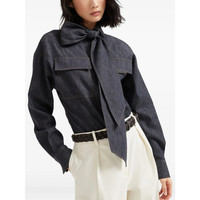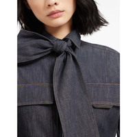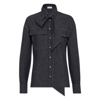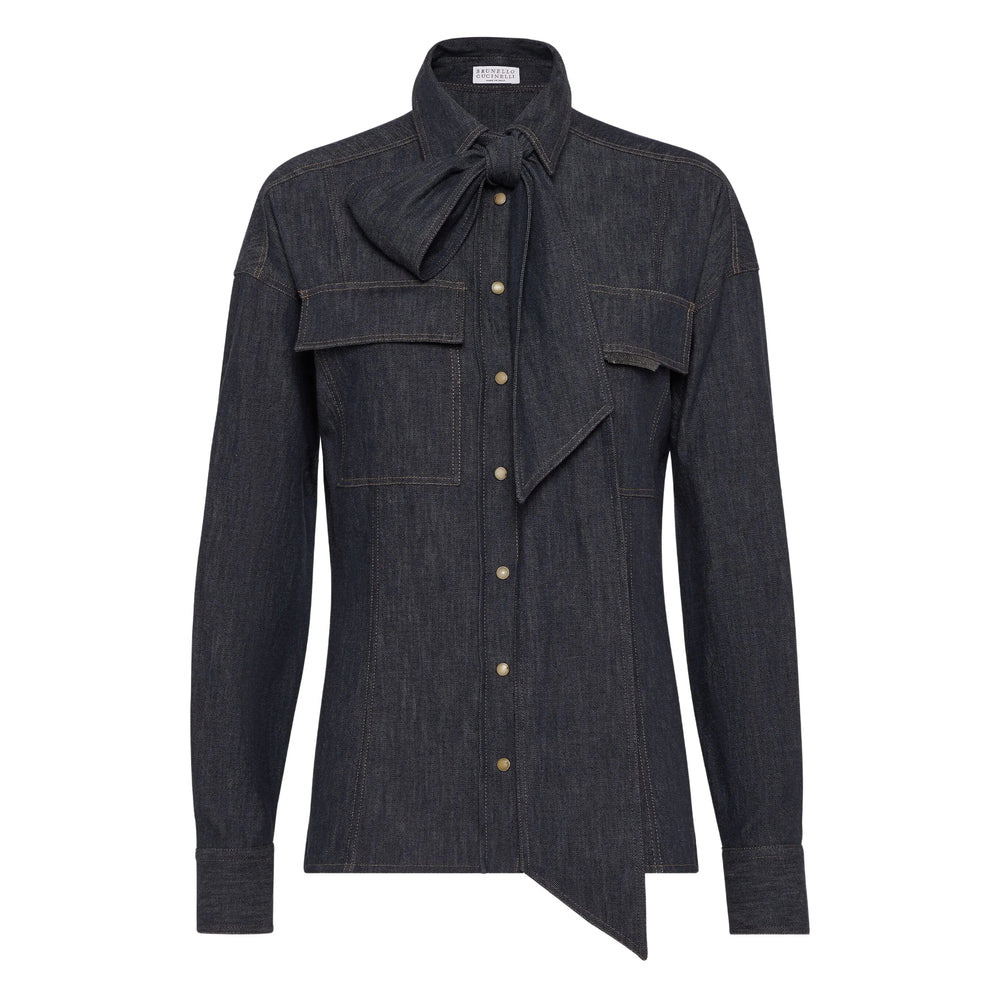 Lightweight no-fade denim pussybow shirt with shiny flap detail