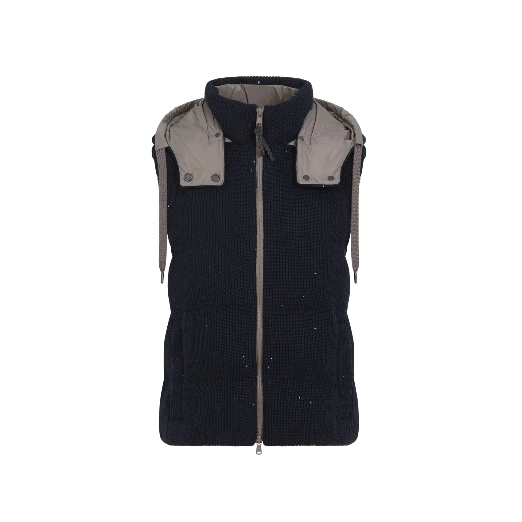 Brunello Cucinelli Abisso Cotton Gilet. Crafted from abisso cotton yarn, fine sequins all over, quilted pattern, feather-filled, detachable and adjustable hood, standing collar, front zip fastening, two front pockets, hidden drawstring at the hem, lined. Feather Down | 96%COTTON 4%POLYESTER 100%POLYAMIDE 90%DOWN 10%FEATHER Size Type: IT SKU: M0DVT2142Blue Our Products Are 100% Genuine. In All Cases We Stand By The Authenticity Of Every Product Sold On Our Site. All sales are final and we only accept returns for quality issue. Buyer is responsible for any import tax/duty if applicable.