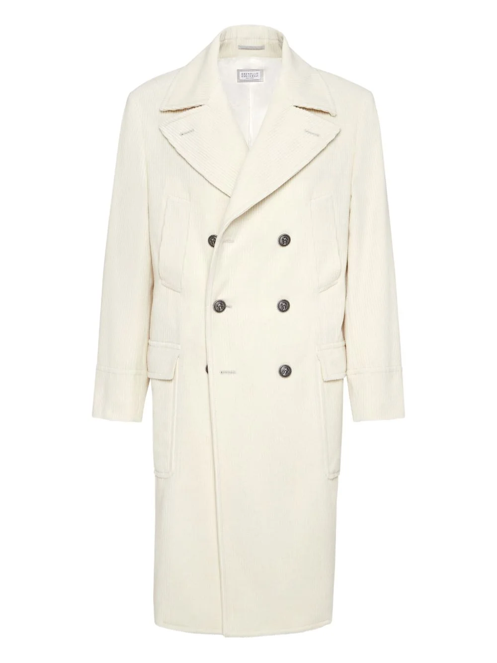 Cashmere wide wale corduroy one-and-a-half-breasted coat with patch pockets and metal buttons