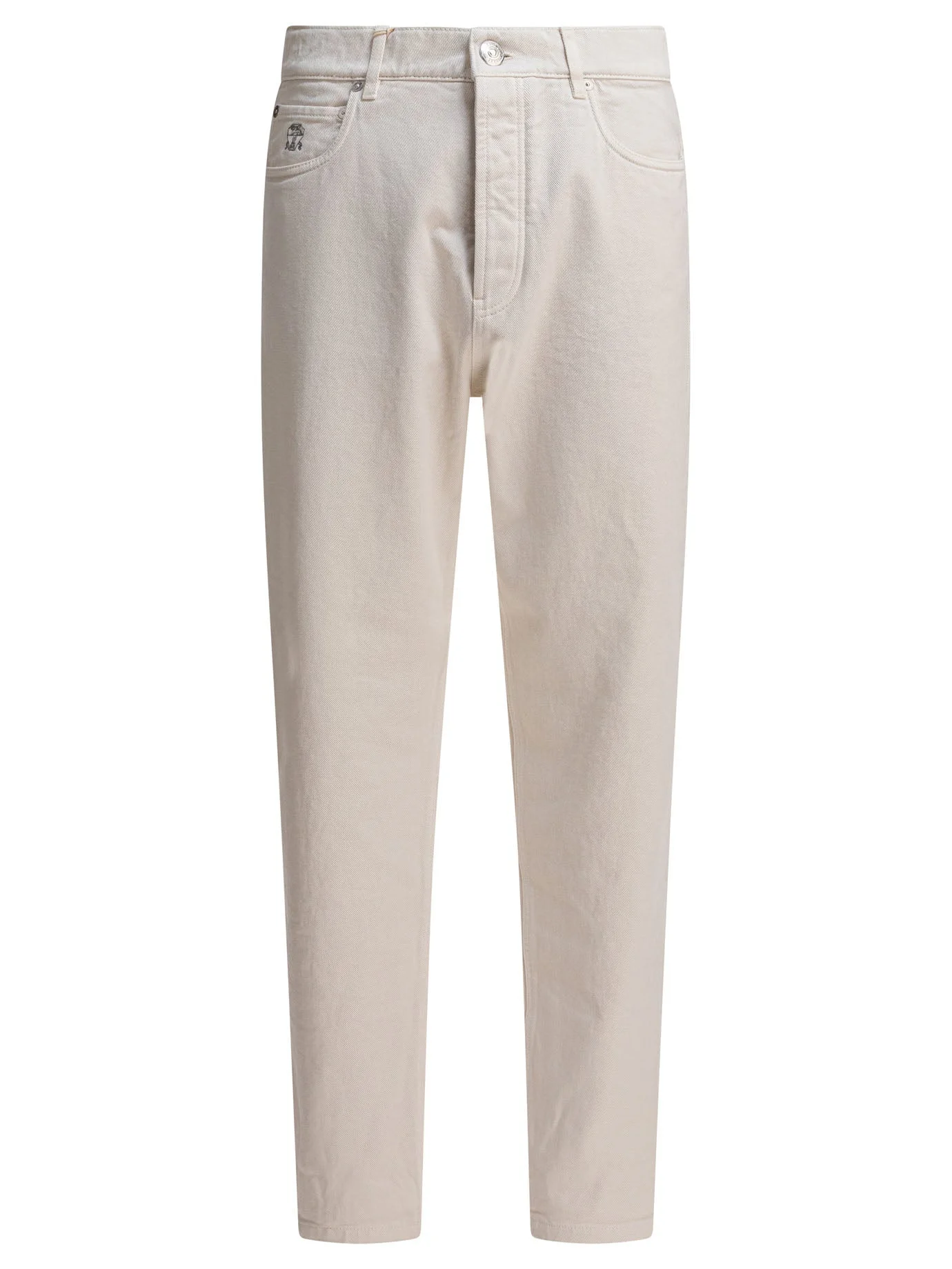 Brunello Cucinelli iconic fit five-pocket pants with pure cotton denim construction, which has undergone garment dyeing to achieve irregular shades visible along seams and edges. Silhouette features slightly high waist and regular leg development. Metal button front closure, front pockets with breast pocket and back patch pockets. Fabric offers balanced weight for comfort during wear. || - Solid color - Mid-rise - Pure cotton denim - Garment dyed with irregular shades - Metal button closure - Front pockets with breast pocket - Back patch pockets - Regular fit 100% cotton SKU: M237UO1090C7007 Our Products Are 100% Genuine. In All Cases We Stand By The Authenticity Of Every Product Sold On Our Site. All sales are final and we only accept returns for quality issue. Buyer is responsible for any import tax/duty if applicable.