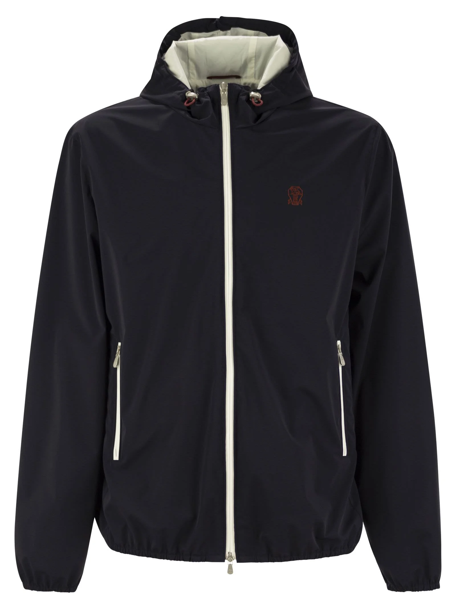 The ultra-light and comfortable texture of the membrane nylon makes this hooded jacket, part of the Travelwear line, versatile and functional, dedicated to moments of relaxation and leisure. The zip fastening with double cursor, the adjustable hood and the elasticated cuffs and hem enhance the casual taste of the garment. Finally, the Solomeo logo detail on the chest adds a personalised touch. Nylon is a lightweight fabric with a thin internal membrane that perfects weather resistance without compromising breathability. - Zip closure with double slider - Lined and adjustable hood with drawstring - Low pockets with zip - Cuffs with internal elastic - Bottom with internal elastic - Two inside pockets with zip closure - Full lining made of water-repellent nylon DESIGNER ID: MM49A7440G C1086 83% Polyamide, 17% Elastane Lining: 100% Nylon Size Type: INT SKU: MM49A7440GC1086 Our Products Are 100% Genuine. In All Cases We Stand By The Authenticity Of Every Product Sold On Our Site. All sales are final and we only accept returns for quality issue. Buyer is responsible for any import tax/duty if applicable.