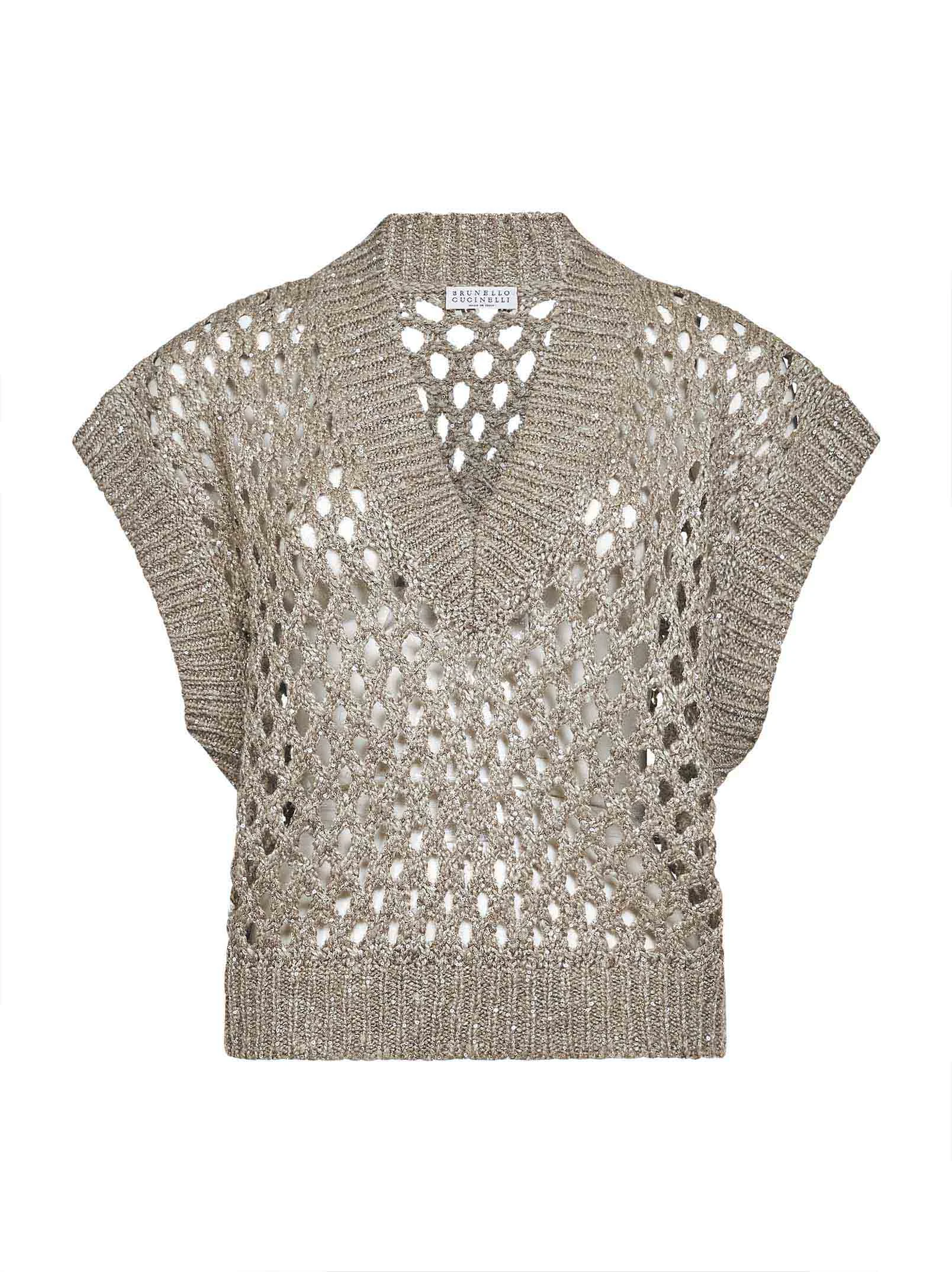 Brunello Cucinelli Women Beige Silk And Linen Dazzling Net Sweater
