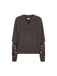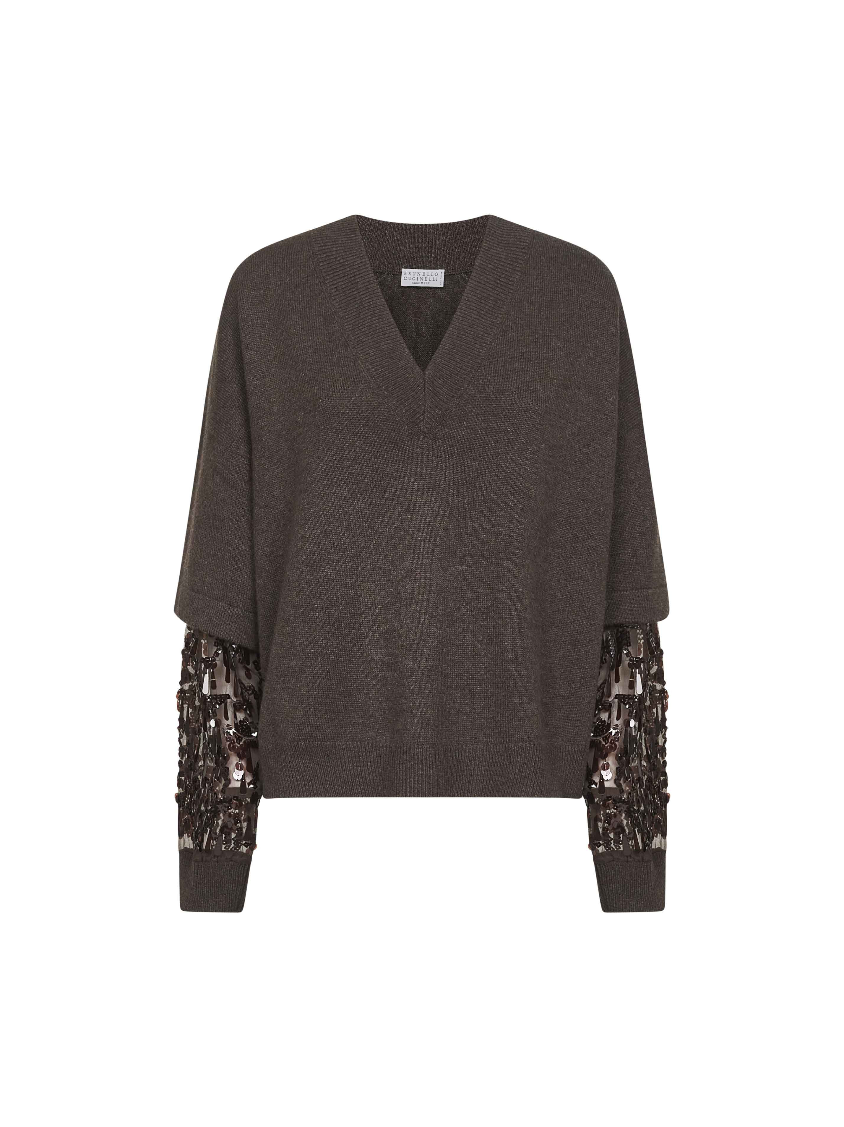 •Ribbed V-neck •Long knit and sequin-embellished tone-on-tone sheer georgette layered sleeves, dropped shoulders •Ribbed cuffs and bottom band •Relaxed fit •Brown color •100% Cashmere •Made in Italy SKU: m12730002-c2559 Our Products Are 100% Genuine. In All Cases We Stand By The Authenticity Of Every Product Sold On Our Site. All sales are final and we only accept returns for quality issue. Buyer is responsible for any import tax/duty if applicable.