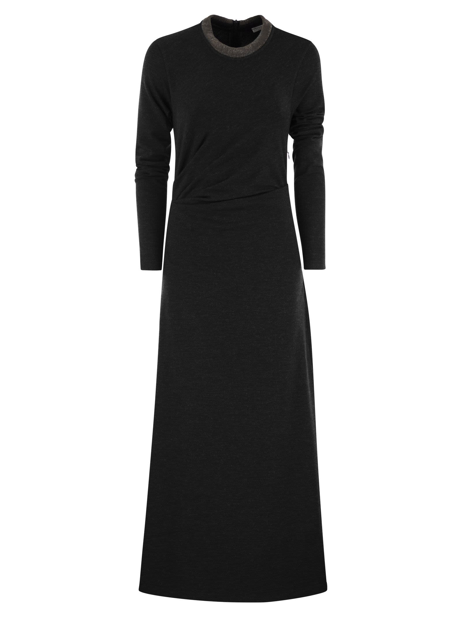 Stretch virgin wool jersey draped dress with precious ribbed collar