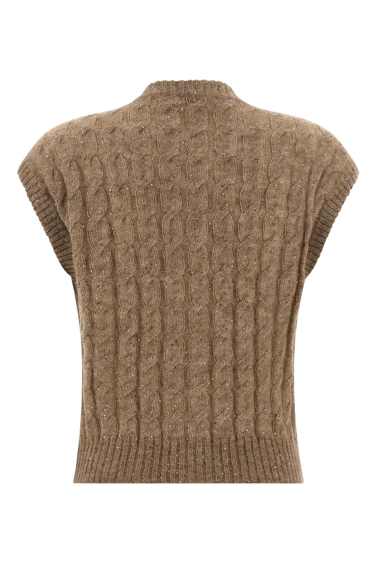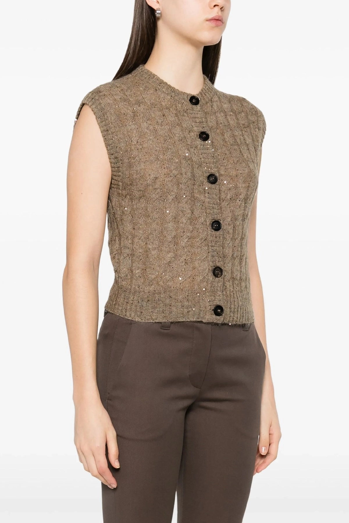 Knitted vest knitted with micro sequin braids, crew neck, front button closure, sleeveless. Color: Brown Size & Fit: True to size fit Composition: 38% mohair wool 28% polyamide 16% cotton 10% wool 8% polyester Made in: Italy SKU: MPG731316PC3592 Our Products Are 100% Genuine. In All Cases We Stand By The Authenticity Of Every Product Sold On Our Site. All sales are final and we only accept returns for quality issue. Buyer is responsible for any import tax/duty if applicable.